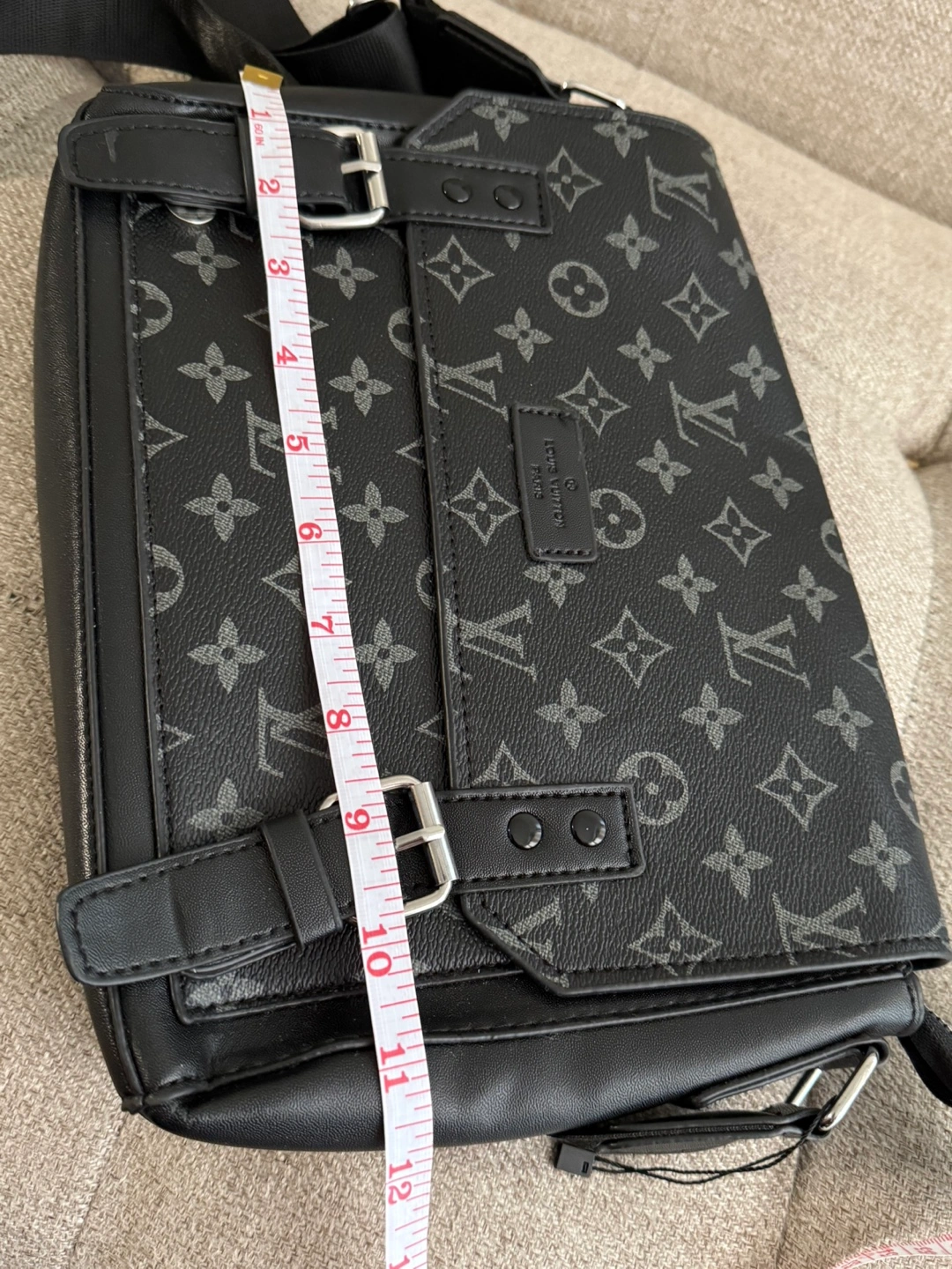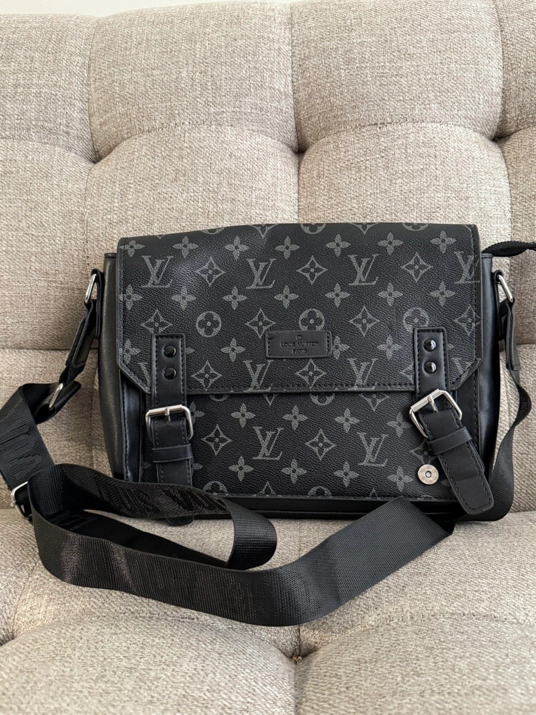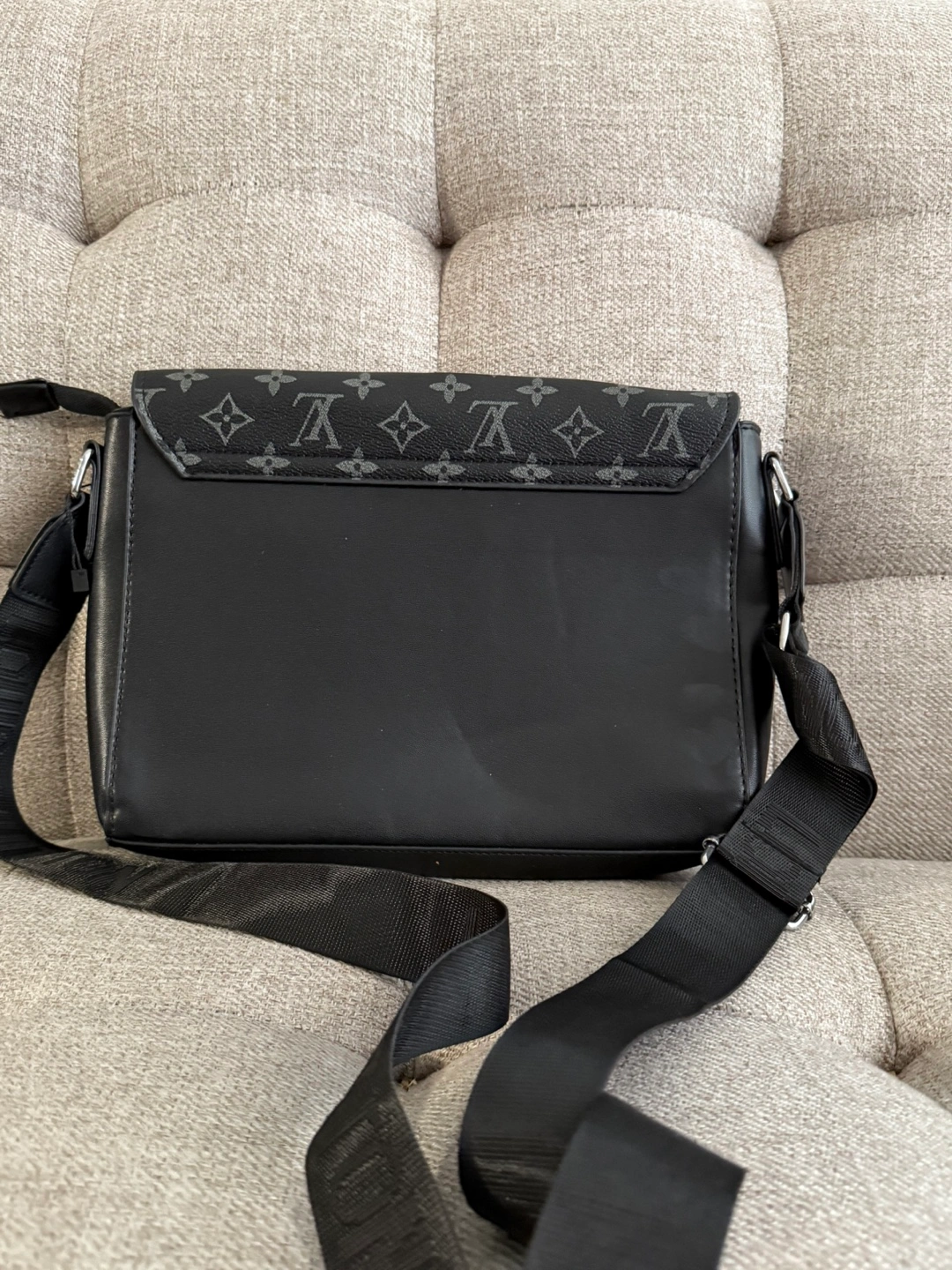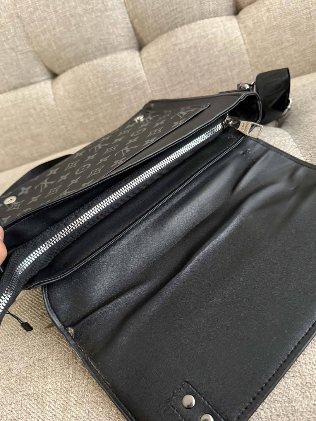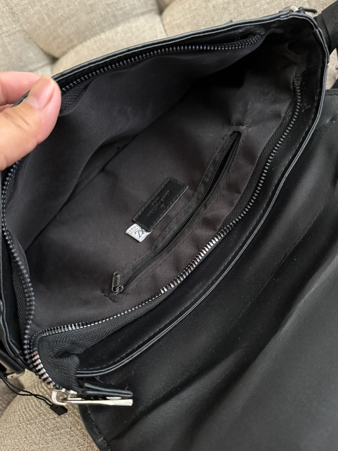 Black messenger bag. The bag features a flap closure with buckles. A zip closure is visible on the interior. Its adjustable strap makes for a comfortable carry. This bag can easily become your new favorite travel companion.