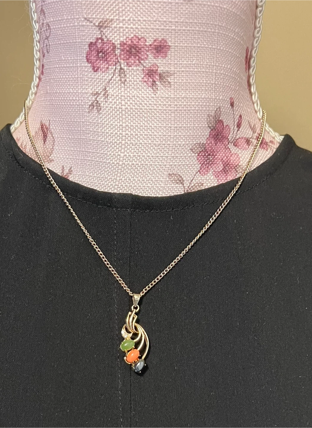 Pendant with 3 oval cabachon stones (green, peach and black) and clear stones accents (top of the pendant)