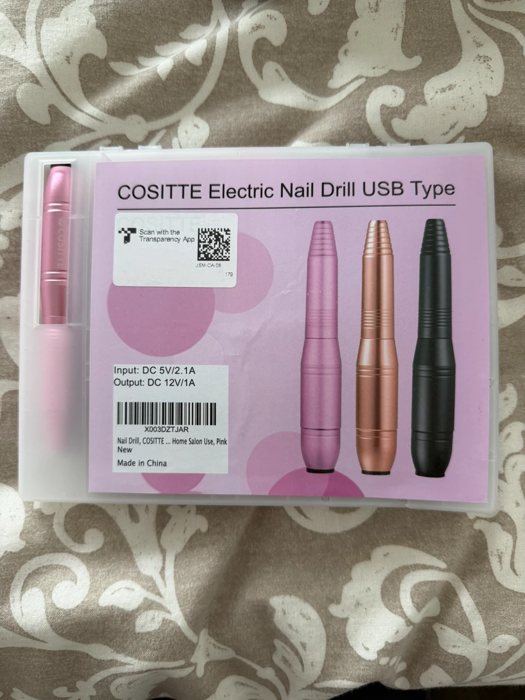 This is a COSITTE electric nail drill, USB type, in pink. It comes with various drill bits for different nail care needs. The device has a USB input for power.