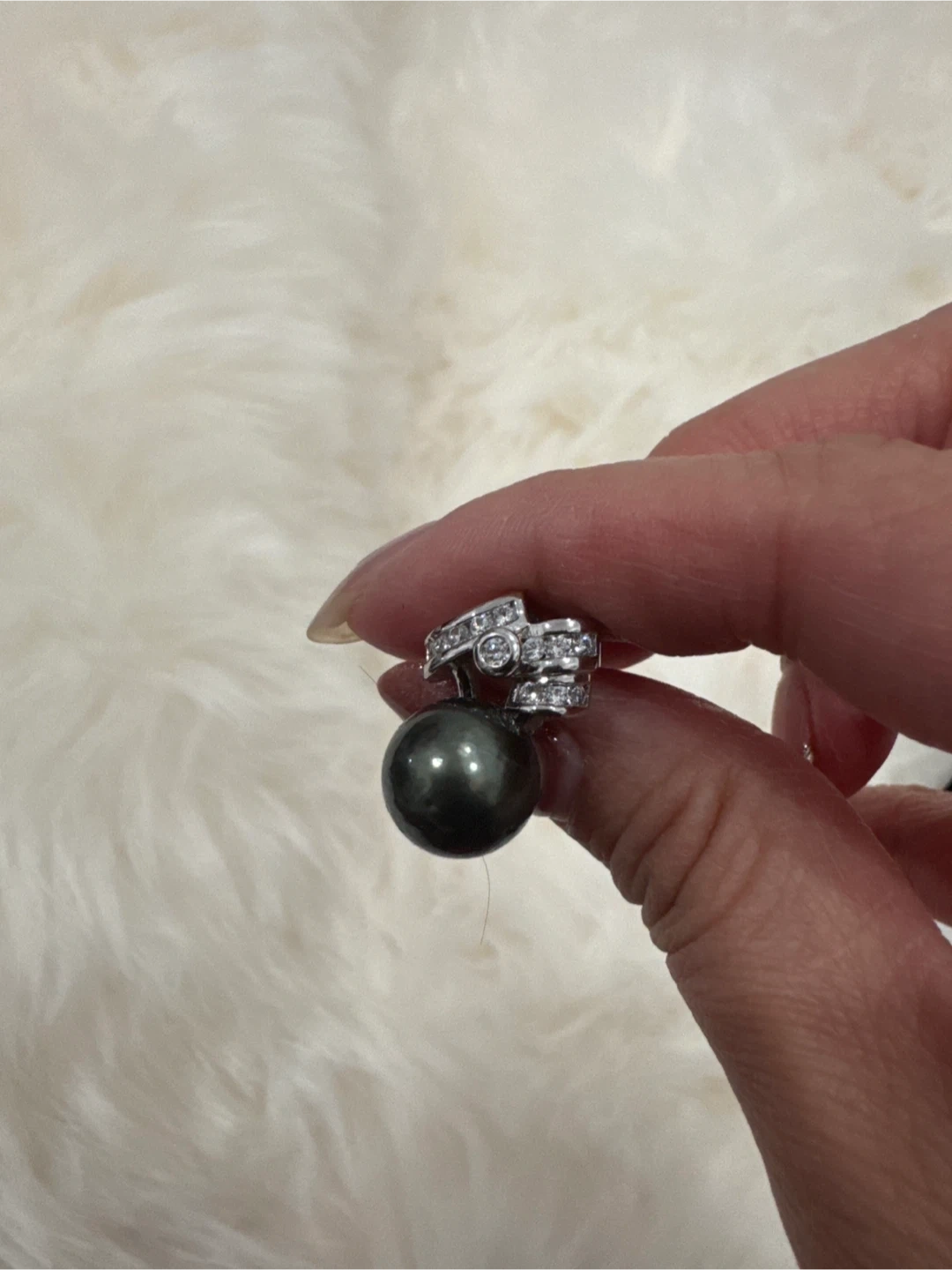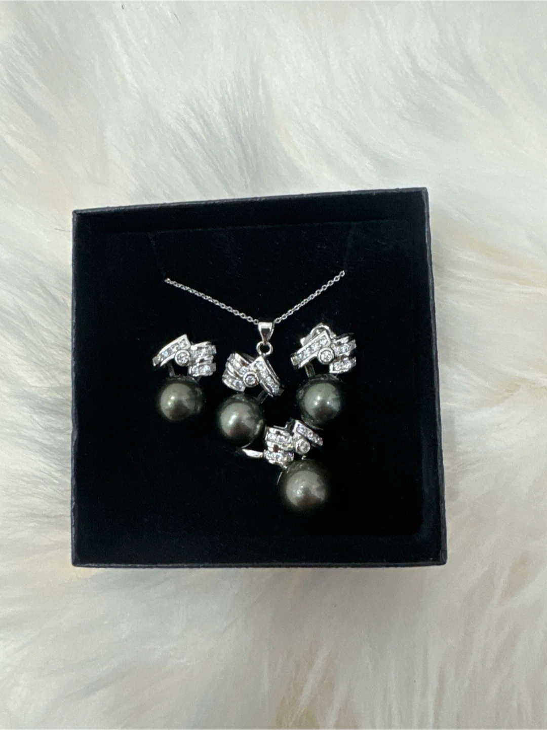 Beautifully Authentic South Sea pearl and diamond jewelry set. Includes a pendant necklace, a matching ring, and a pair of stud earrings. All pieces showcase lustrous dark pearls complemented by sparkling white stones. Comes in a presentation box with Certification of Authenticity.