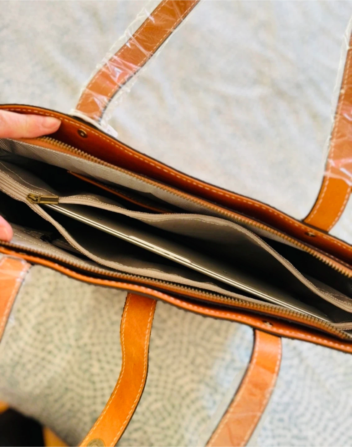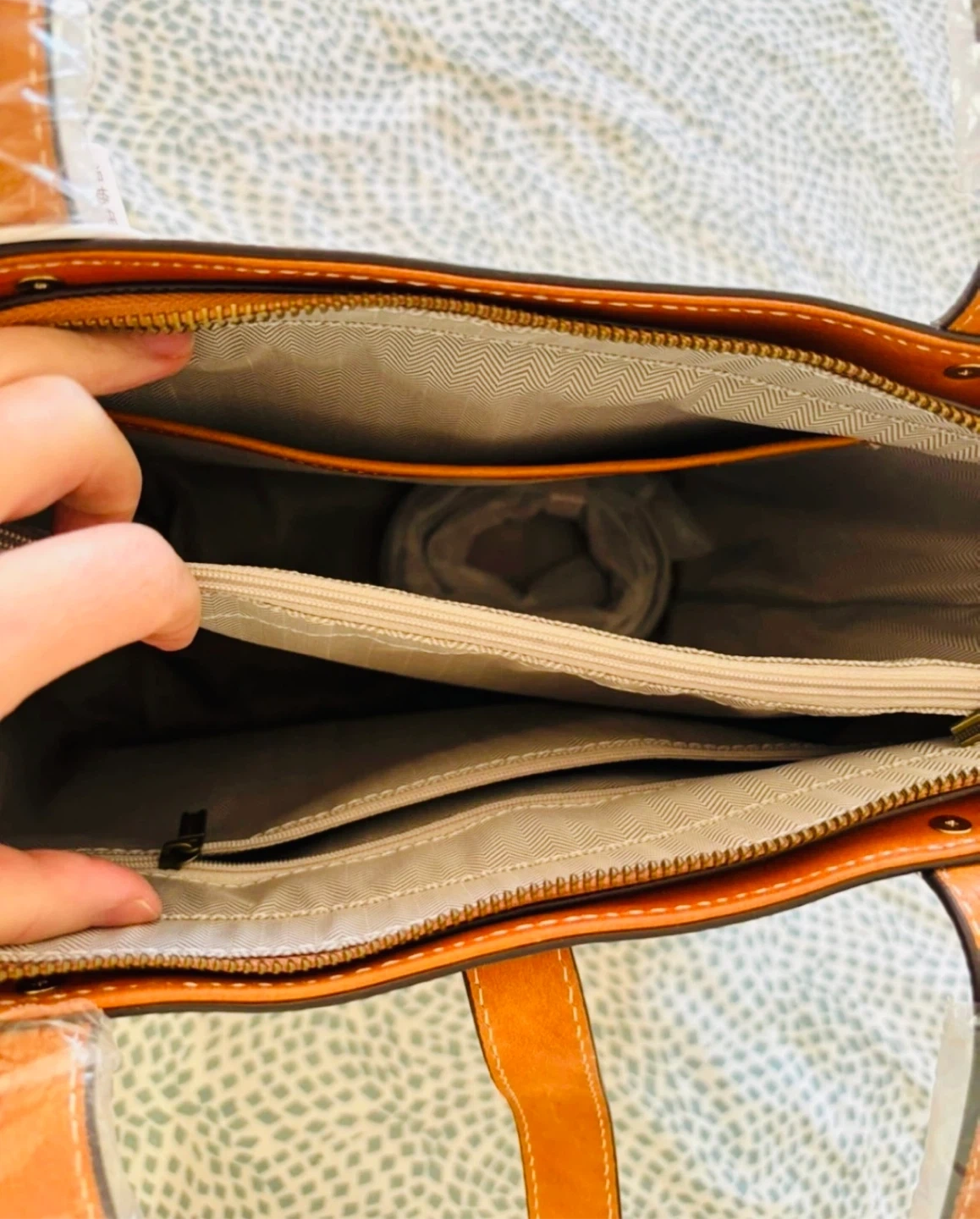 It's made from genuine leather and has a spacious interior with zippered pockets. Four metal studs protect the bottom.