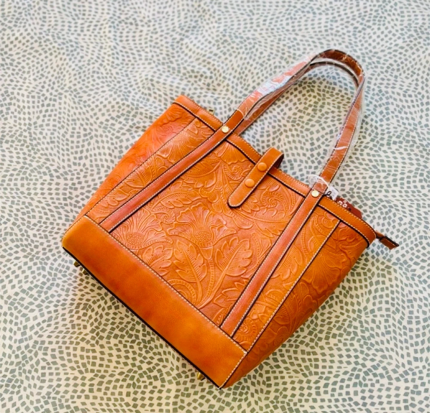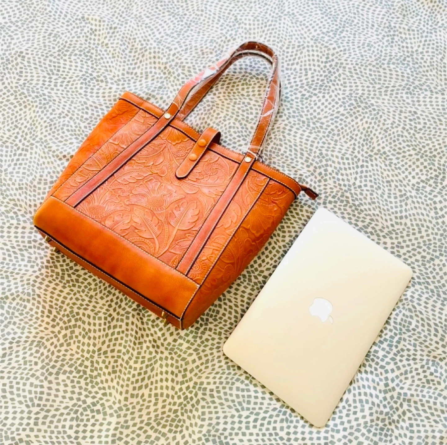 This stylish brown tote bag features a beautiful embossed floral pattern.