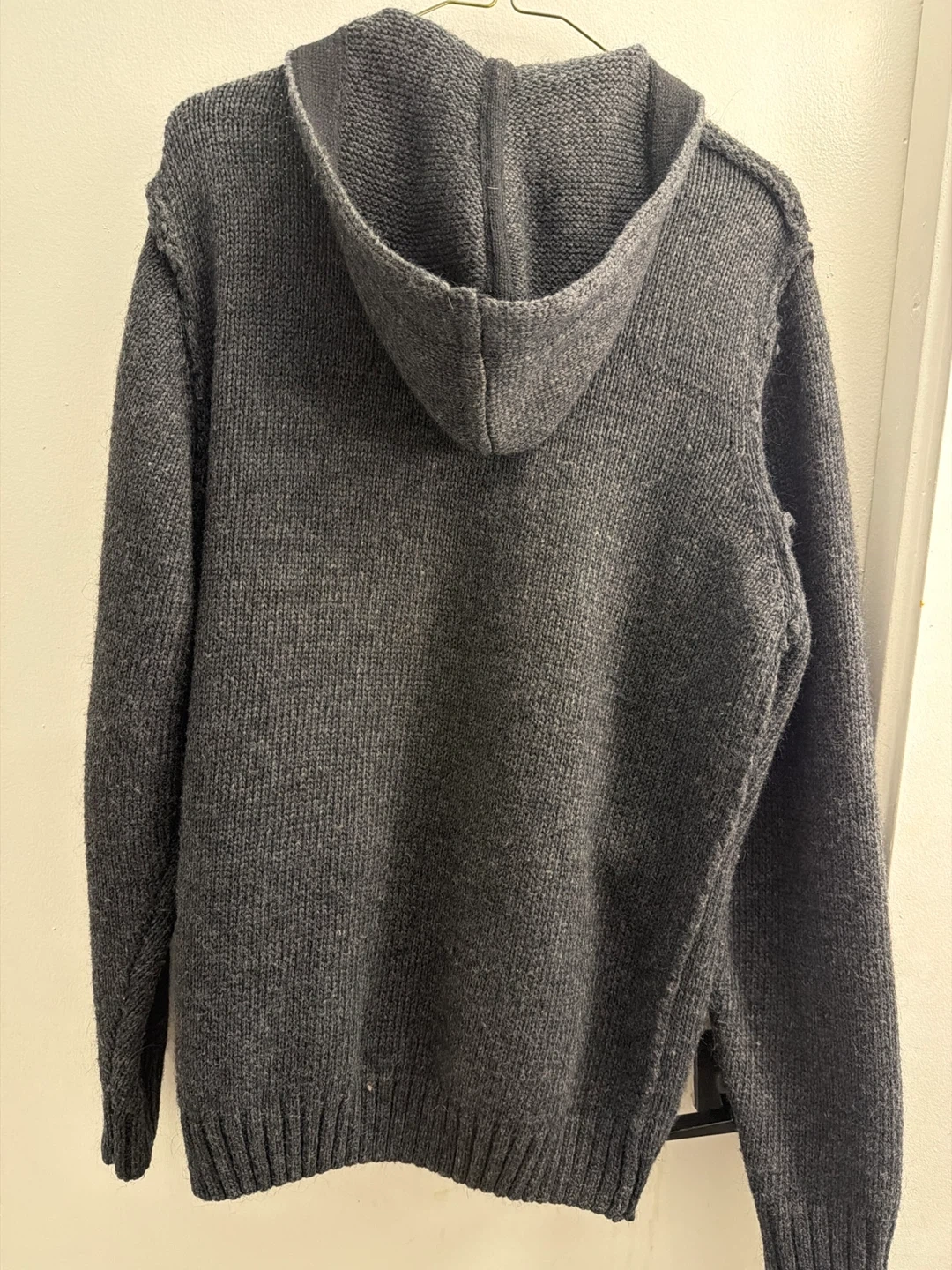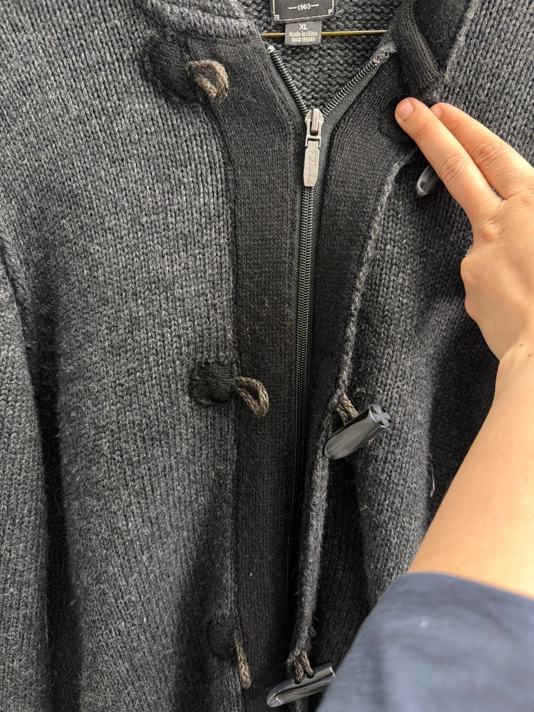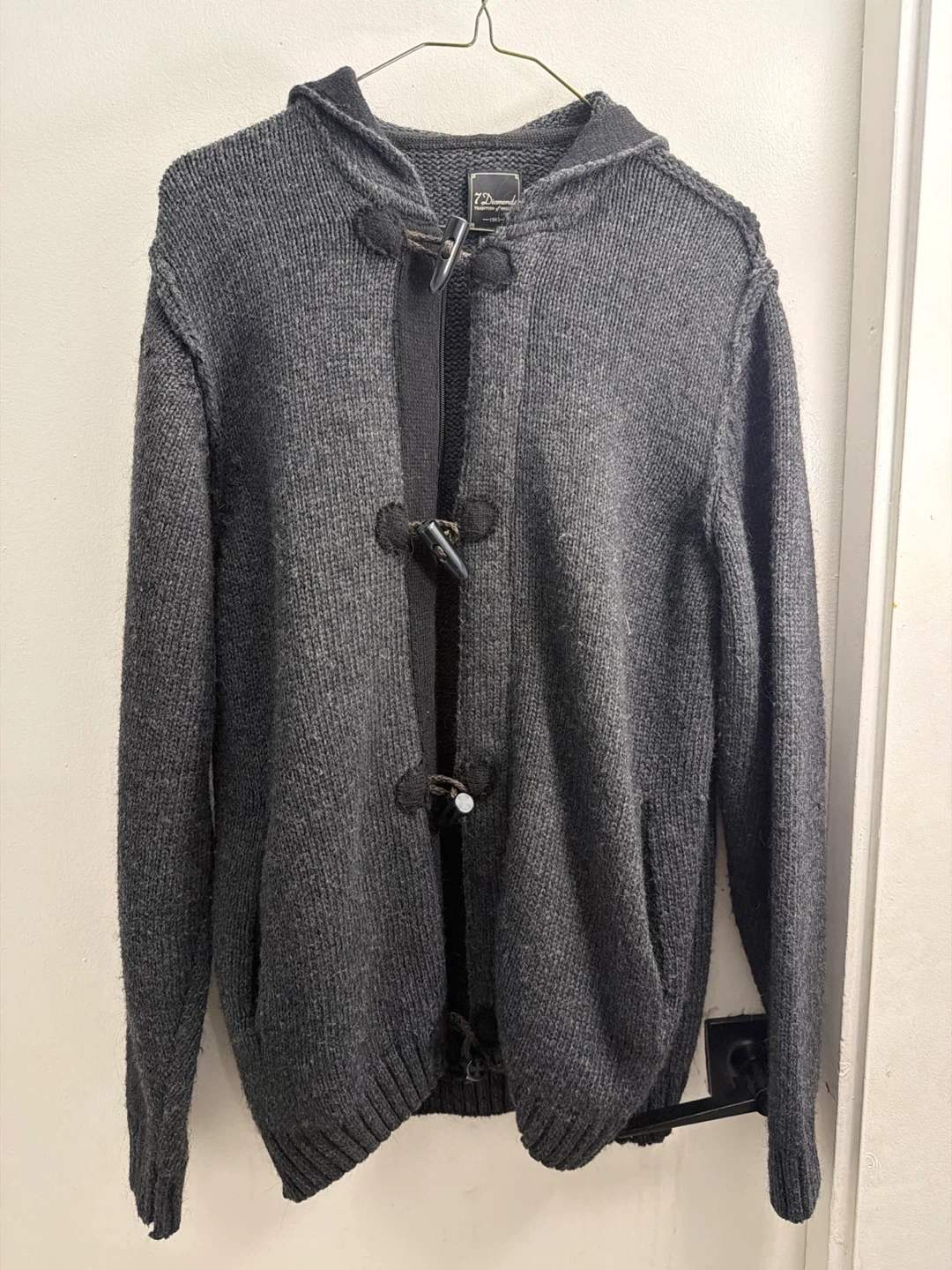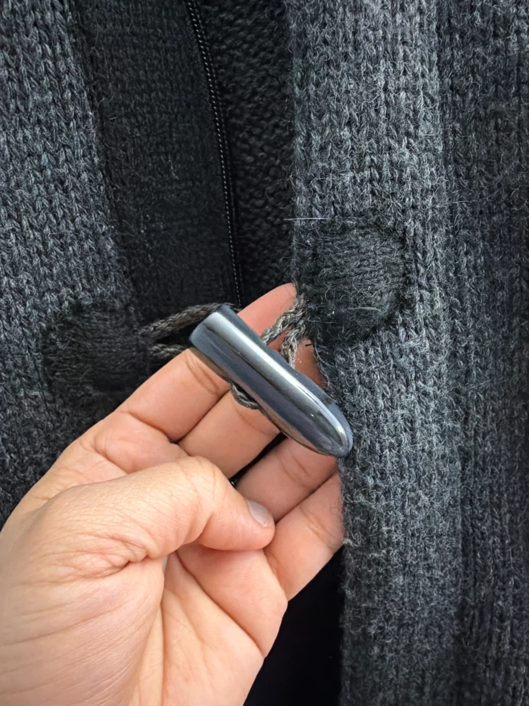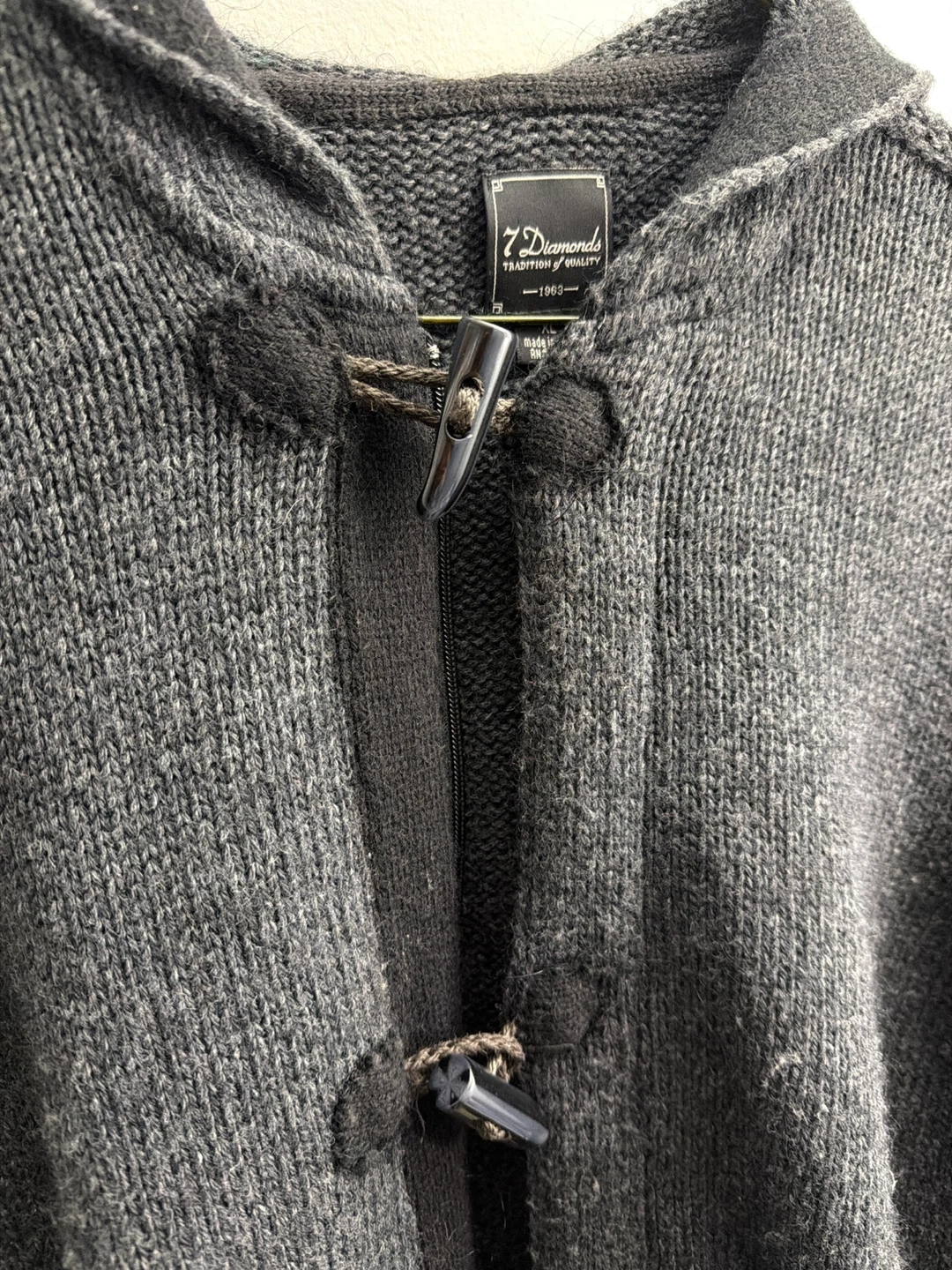 A cozy knit sweater hoodie from 7 Diamonds. Features duffle toggle closures and a full zip. Made with a soft, dark grey knit material. Perfect for layering on cooler days!