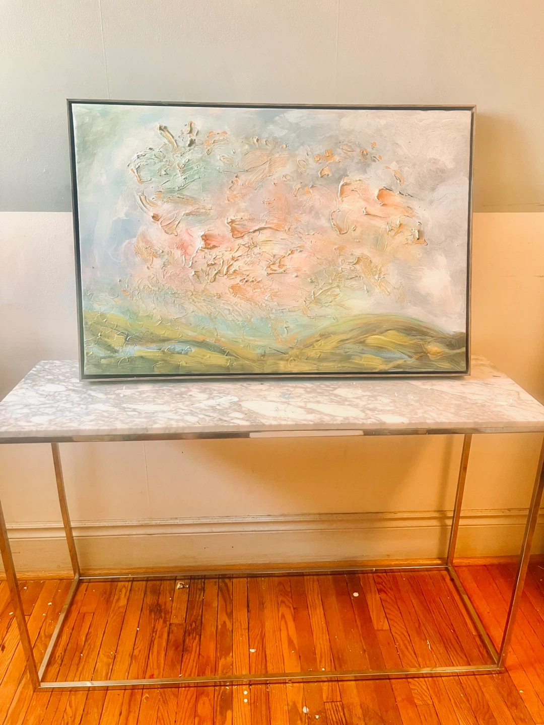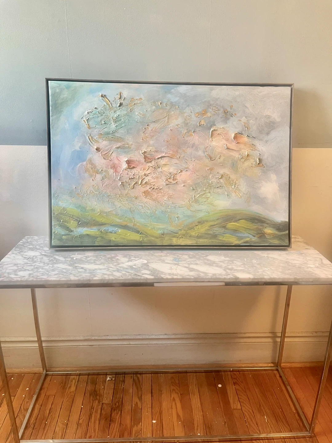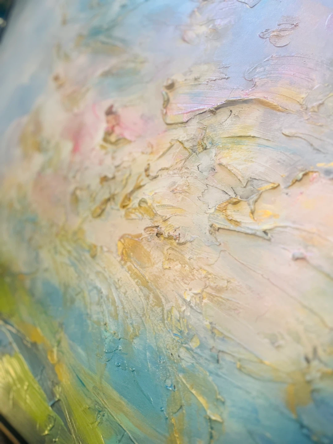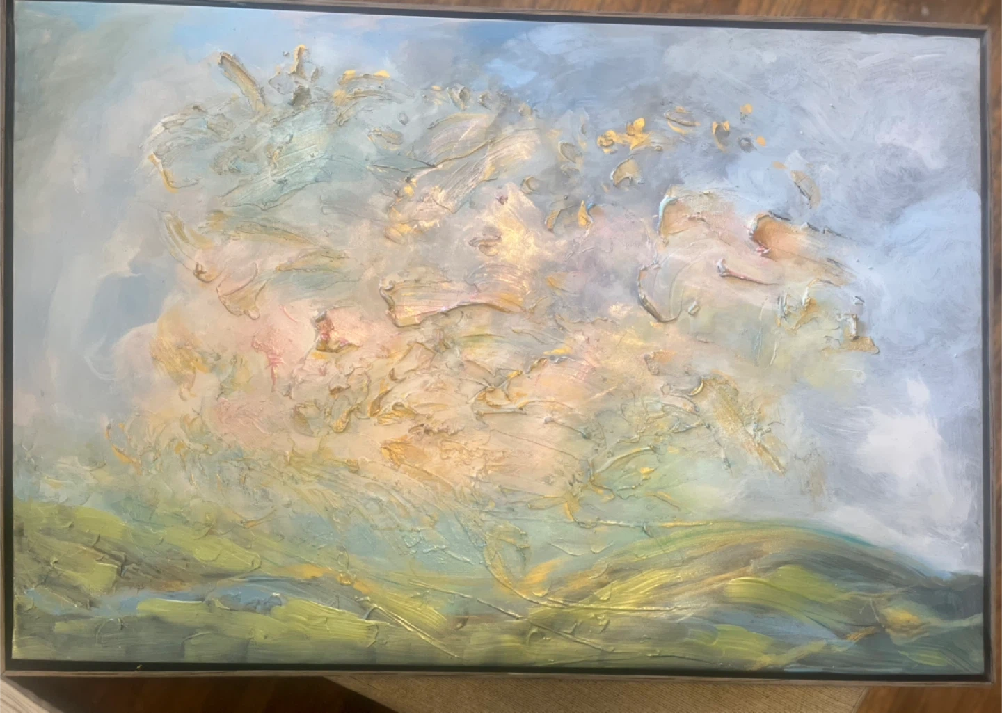 Textured painting with impasto technique. Features soft blues, greens, and warm yellows. It's an abstract landscape. Thick brushwork with gold patina in a modern floater frame. Last 2 photos taken with bright studios lights on and then no lights just sunlight from the left side window.