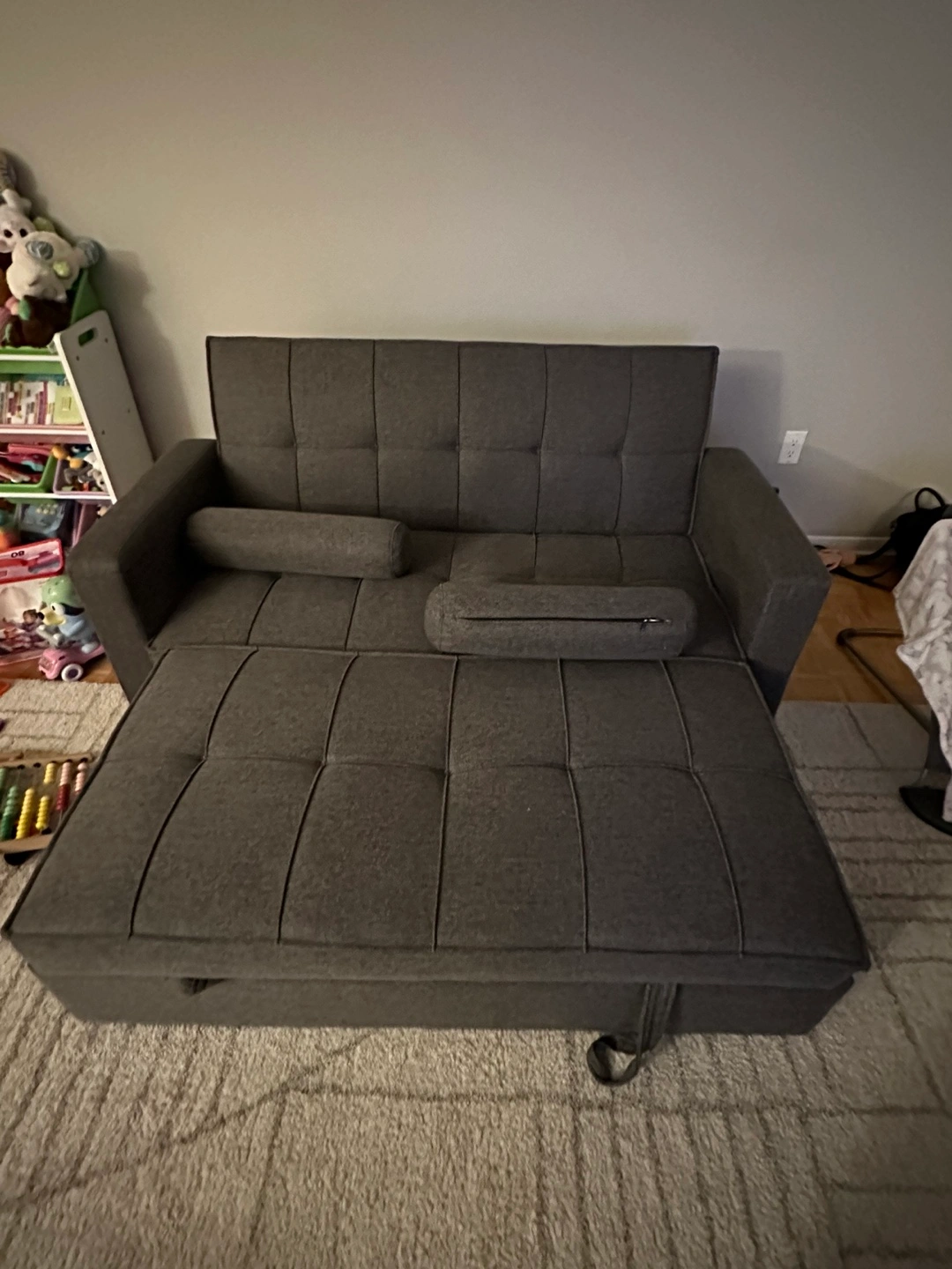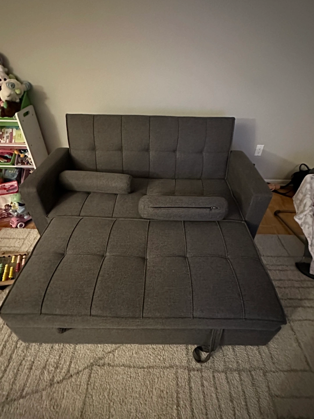 Dark grey fabric futon couch. Pull-out sofa bed. Includes two pillows. Modern style.