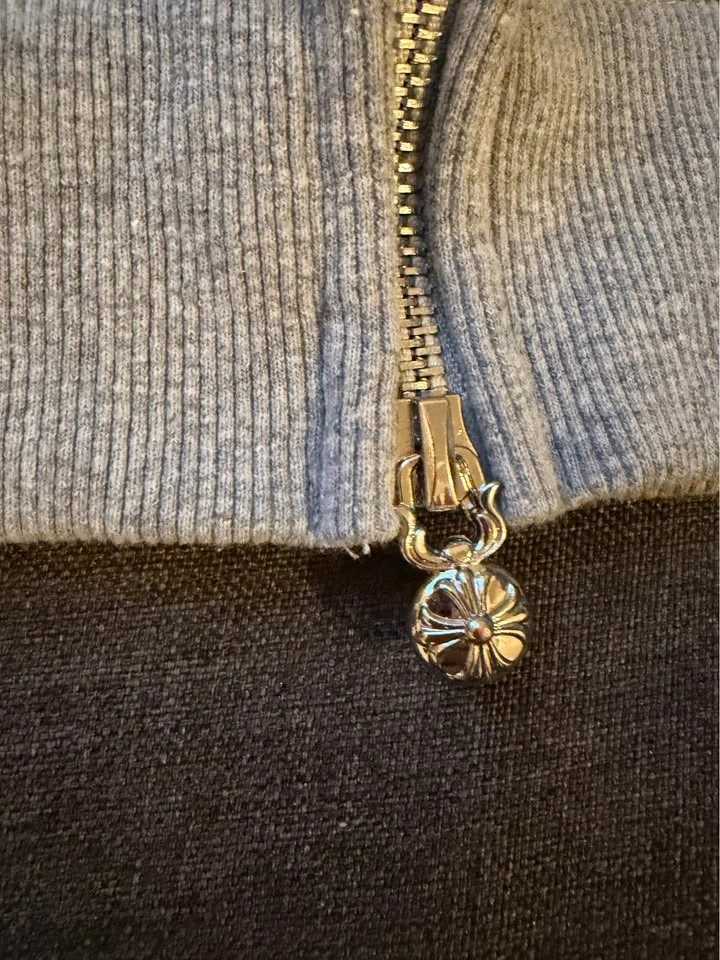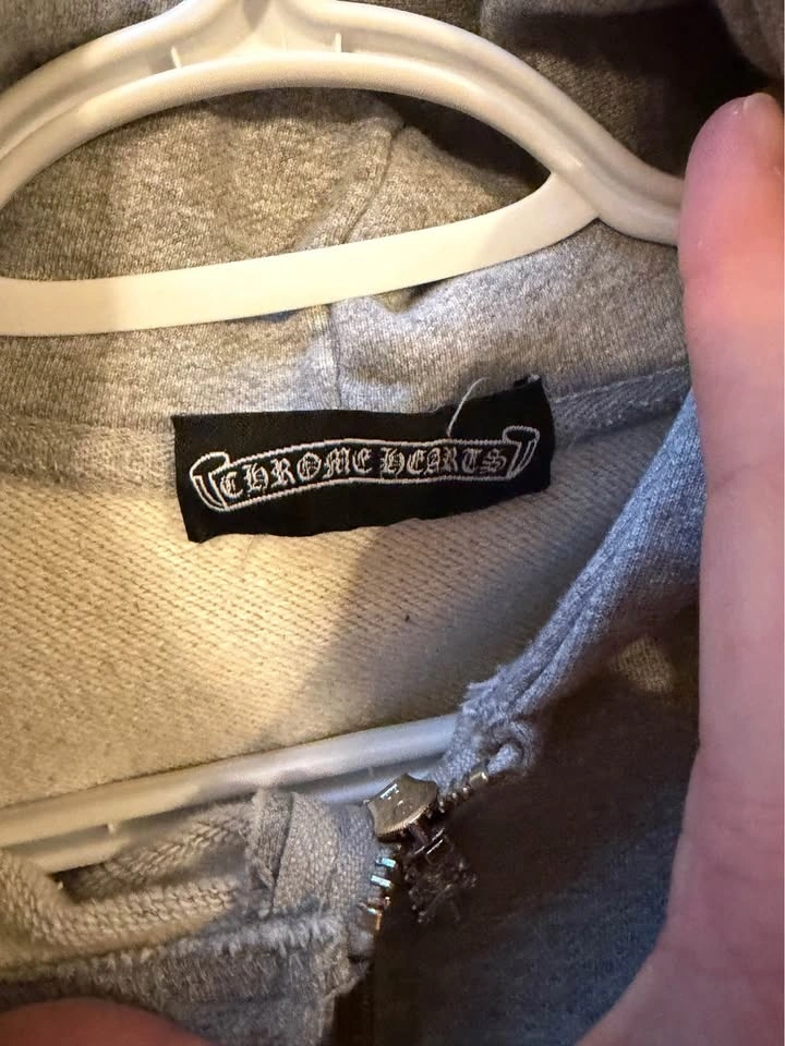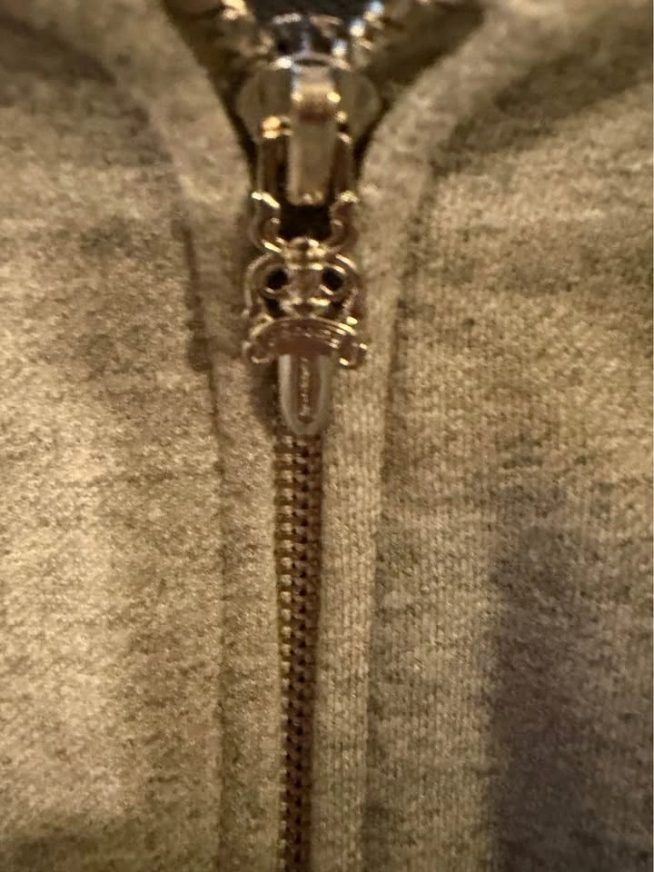 Comfy Chrome Hearts grey zip-up hoodie with a cool black triple cross patch on the front. Features a silver-toned zipper with a decorative pull and front pockets. Super soft and great for layering!
