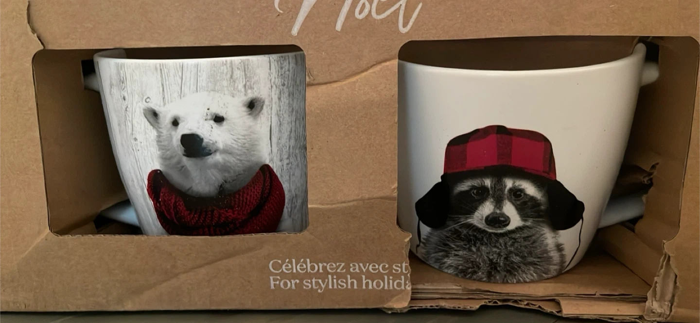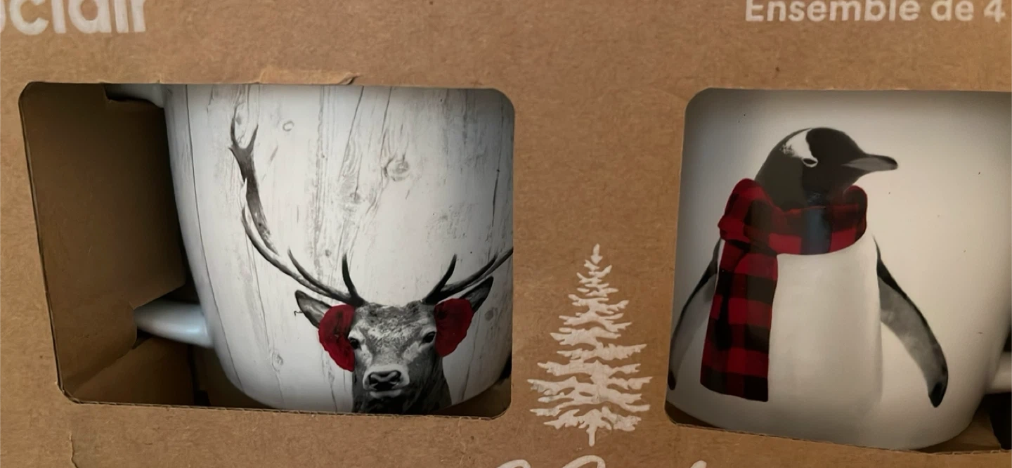 This set includes four mugs, each featuring a unique animal design: a polar bear, a deer, a raccoon, and a penguin. They are 10.5cm x 9cm in size. These mugs are perfect for enjoying your favourite hot beverages during the holiday season!