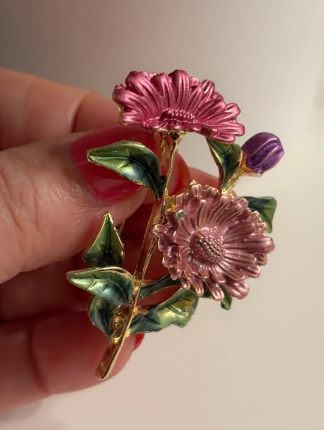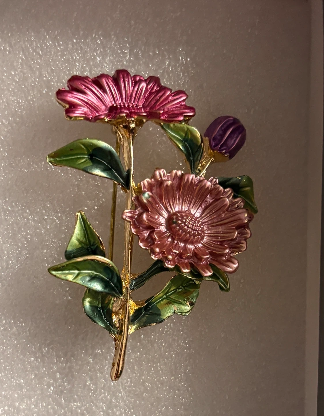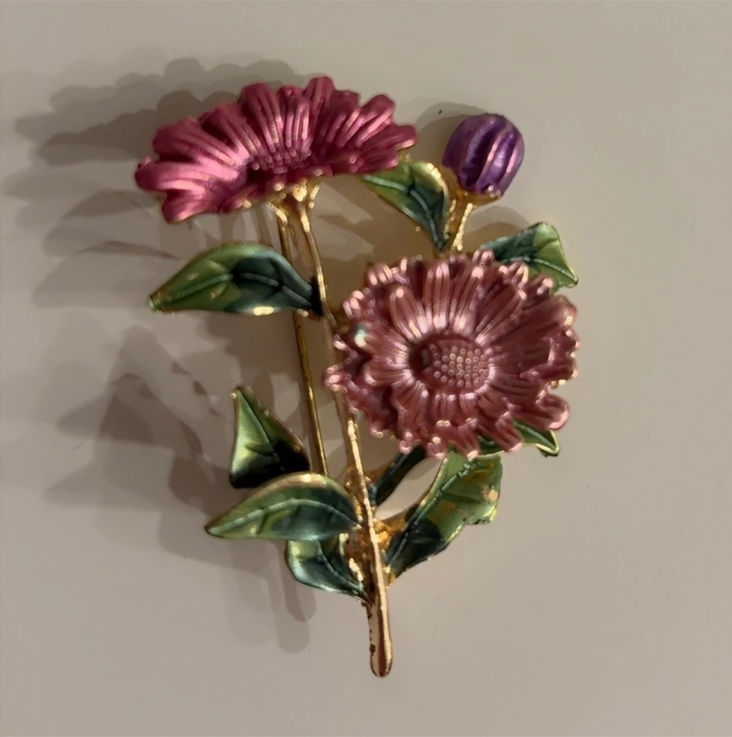 A charming brooch featuring pink and purple flowers with green leaves. It's gold-toned and has a secure pin backing. This accessory adds a floral touch to any outfit!