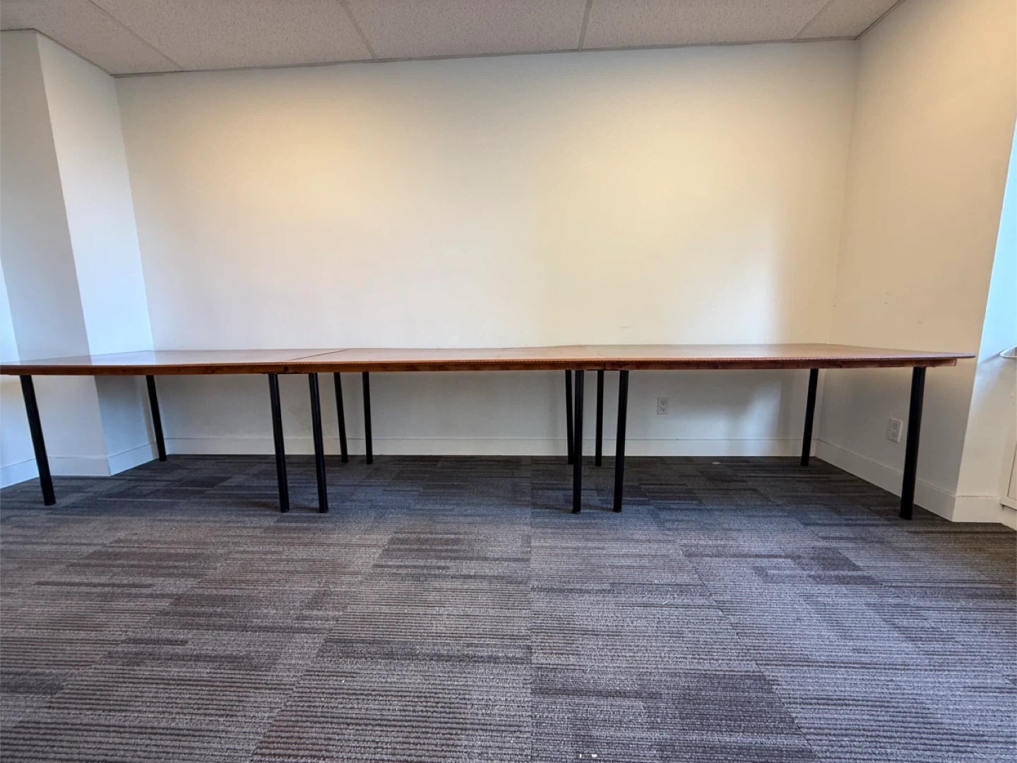 Ready for transport. This is a convertible from 3 nice desks into a long conference/office table with a wooden top and black metal legs. It's made up of multiple sections that join together to form a lengthy surface. It's ideal for meeting rooms or large workspaces. The surface is a warm wood tone with a smooth finish.