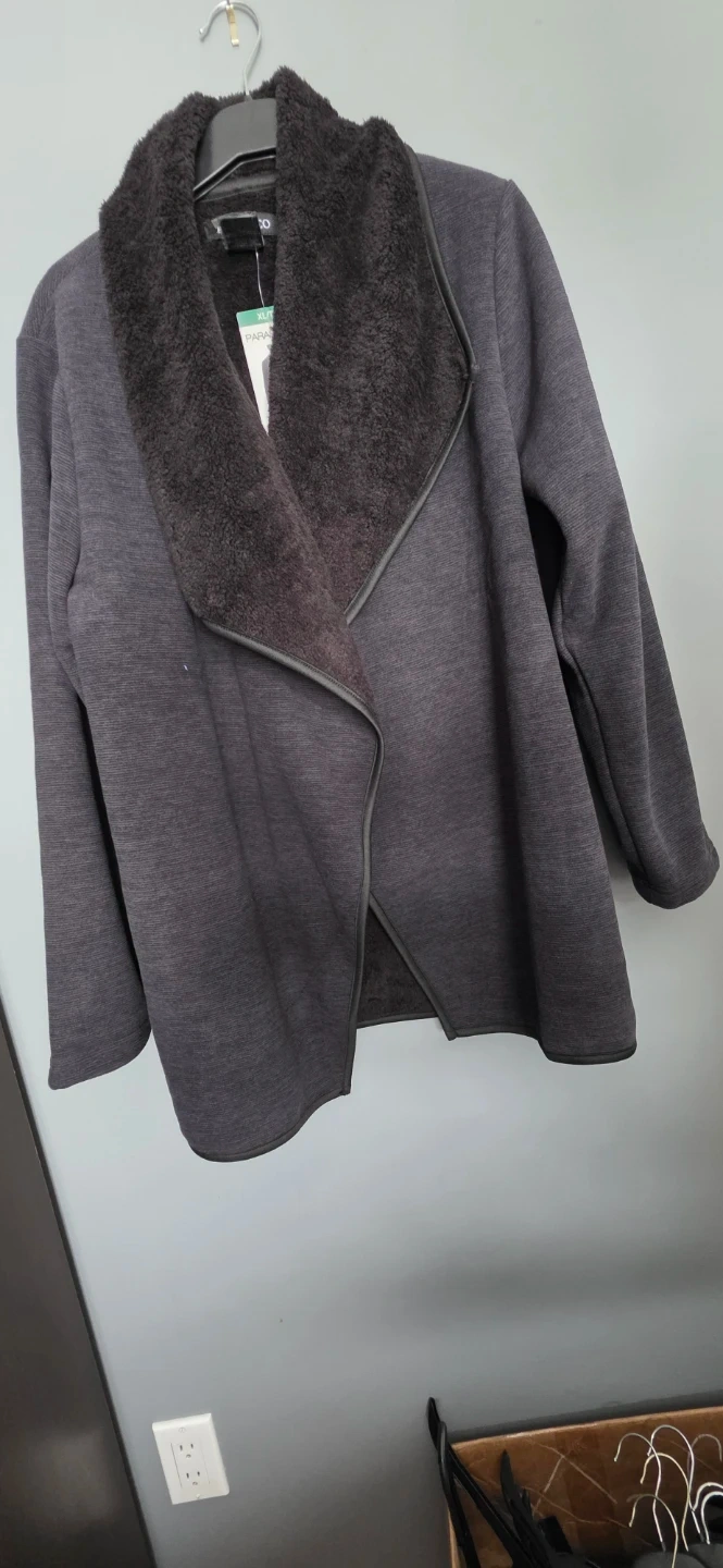Cozy up in this stylish Black shawl collar cardigan. It features a soft fleece lining for extra warmth and comfort. The open-front design and faux trim add a touch of elegance. Perfect for layering during cooler weather!