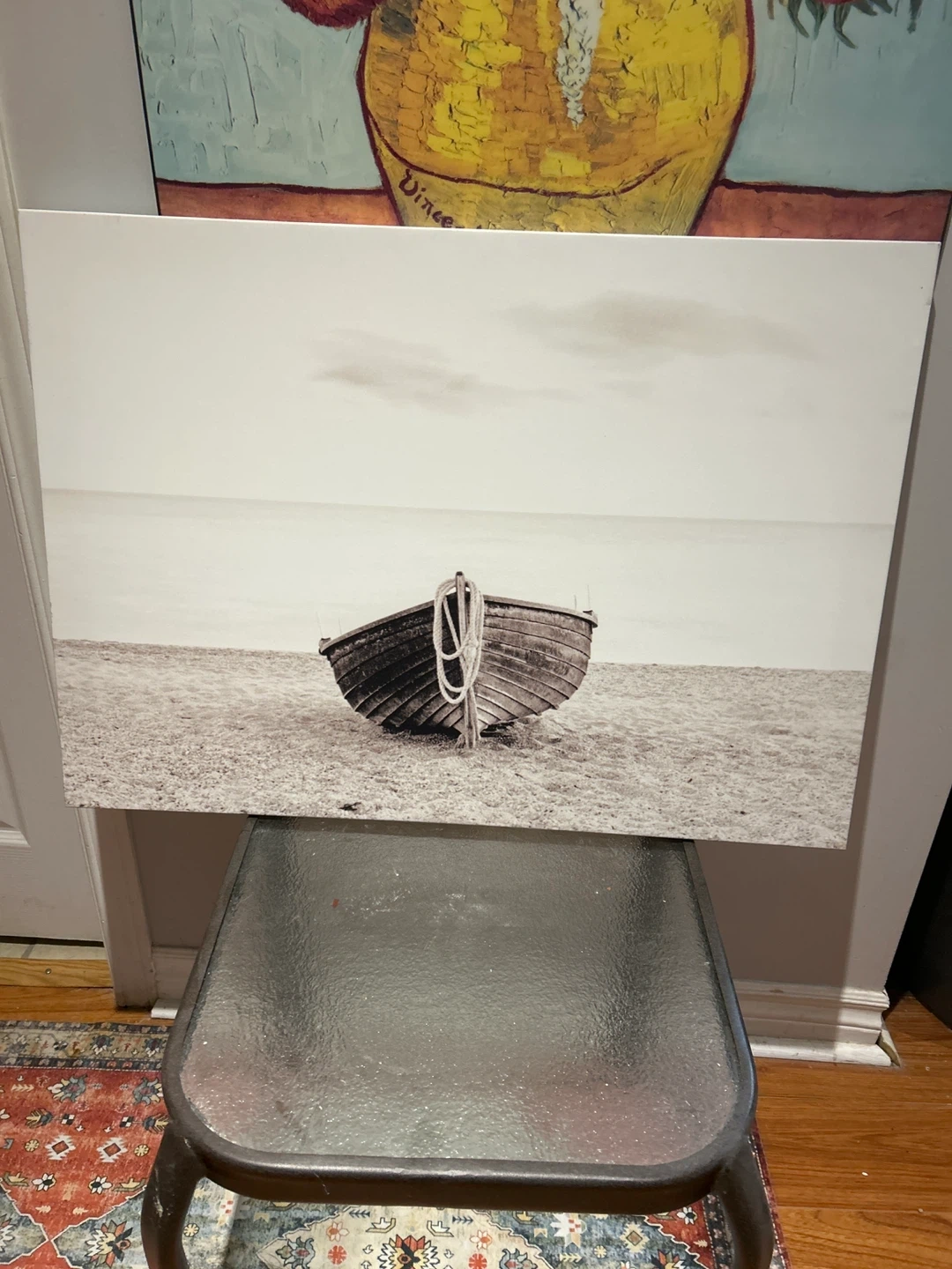 This canvas print features a rowboat resting on a sandy beach with a calm sea in the background. It's a monochromatic image with a serene aesthetic. Perfect for adding a coastal vibe to any room!
