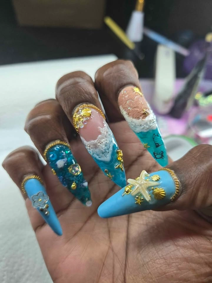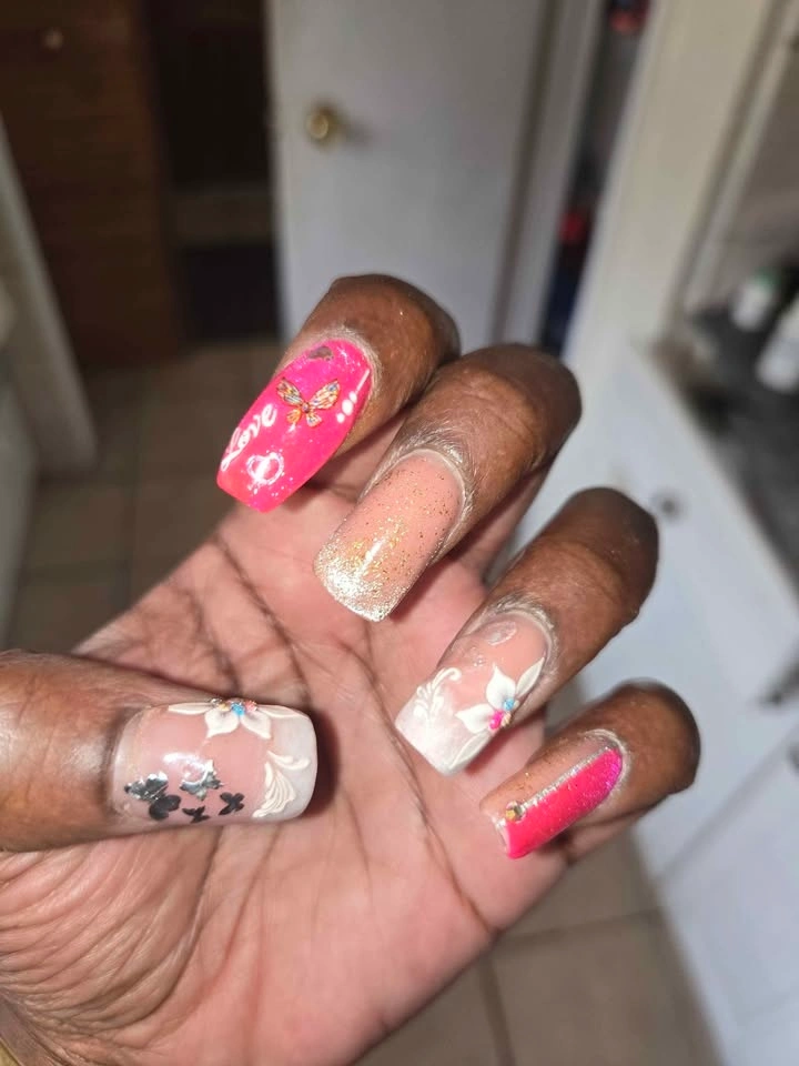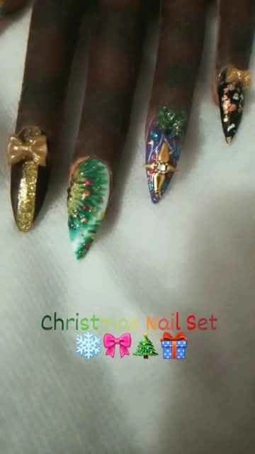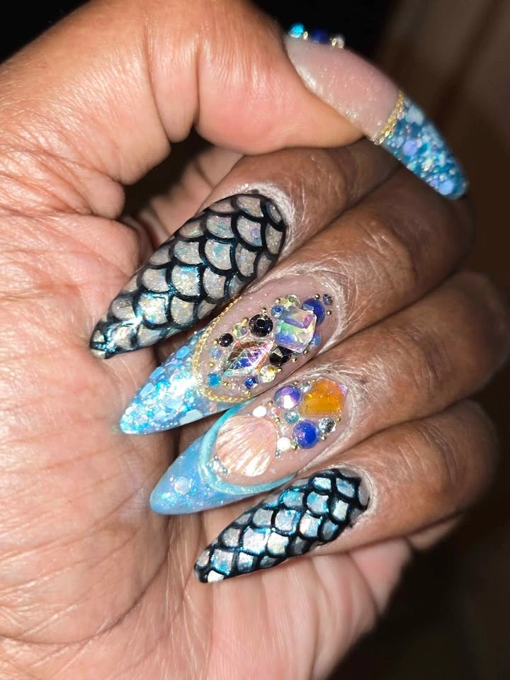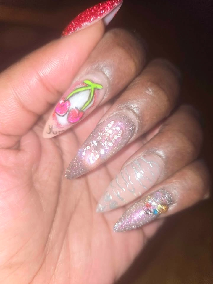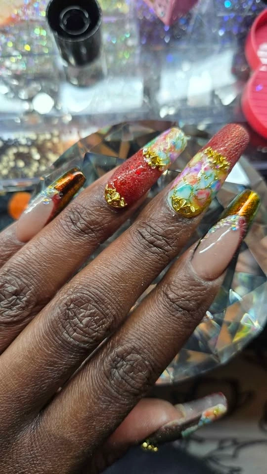 Colorful nail art designs with various patterns and shapes. Some nails have glitter, rhinestones, or other decorations. Different nail shapes and lengths are shown.