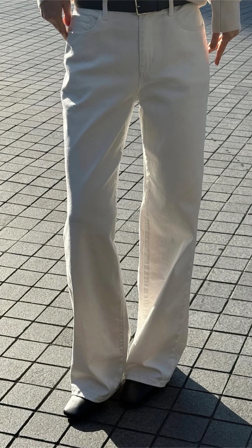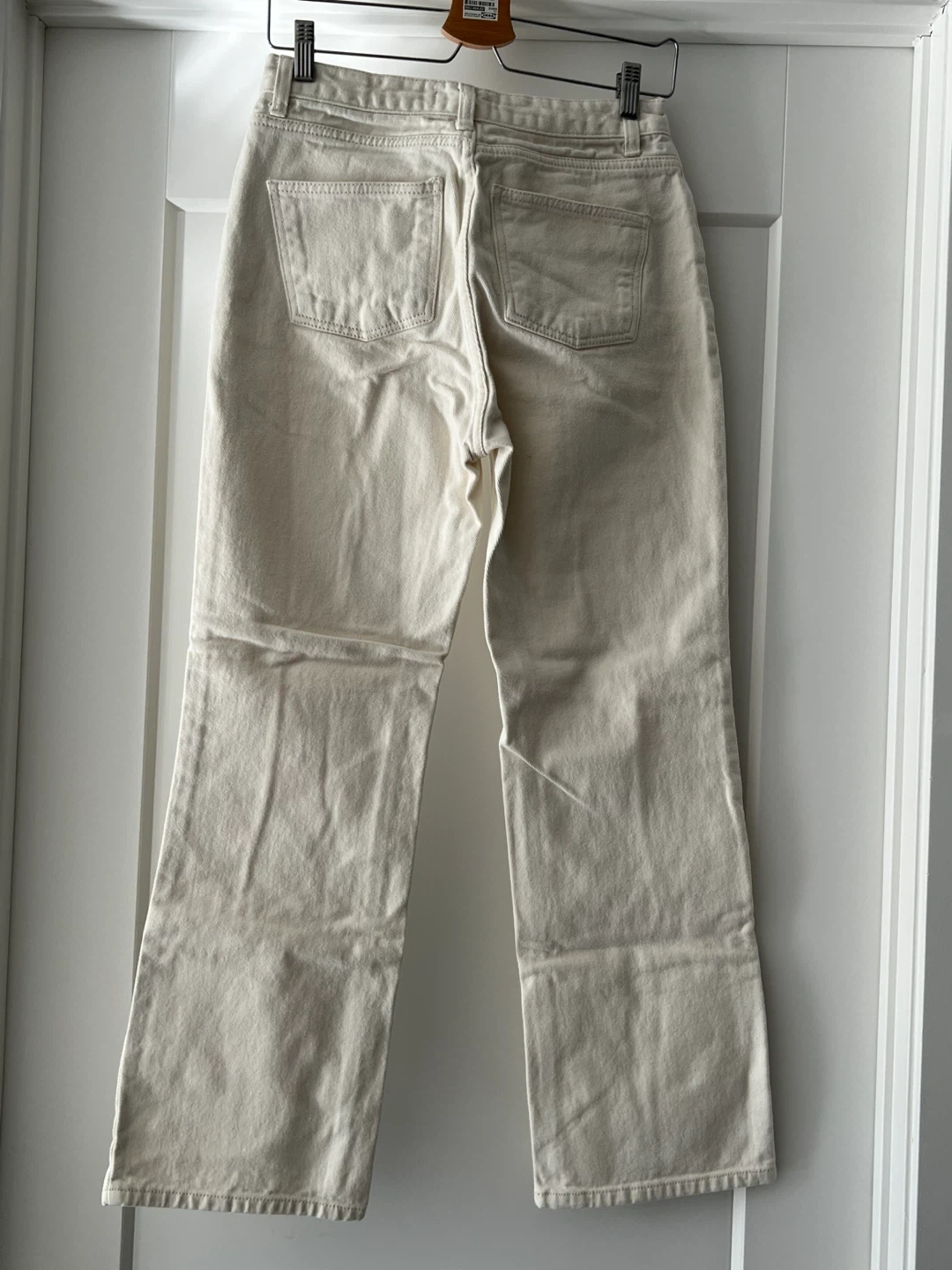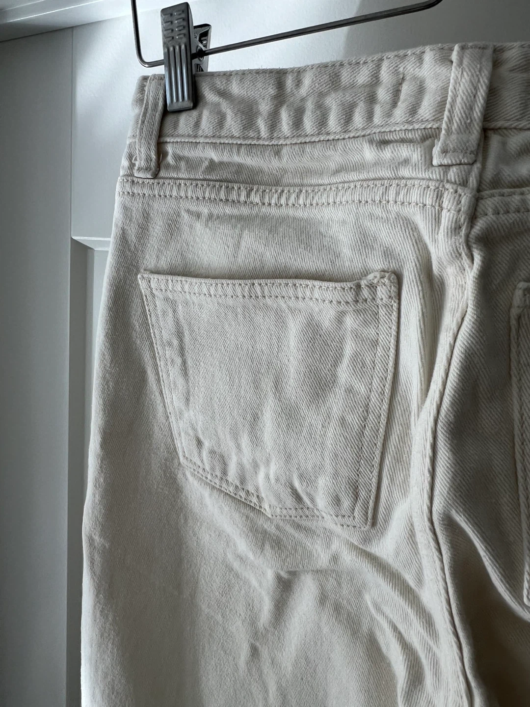 Cream coloured straight denim jeans. Classic five-pocket styling. Button and zip fly closure. These jeans are a versatile staple for any wardrobe!