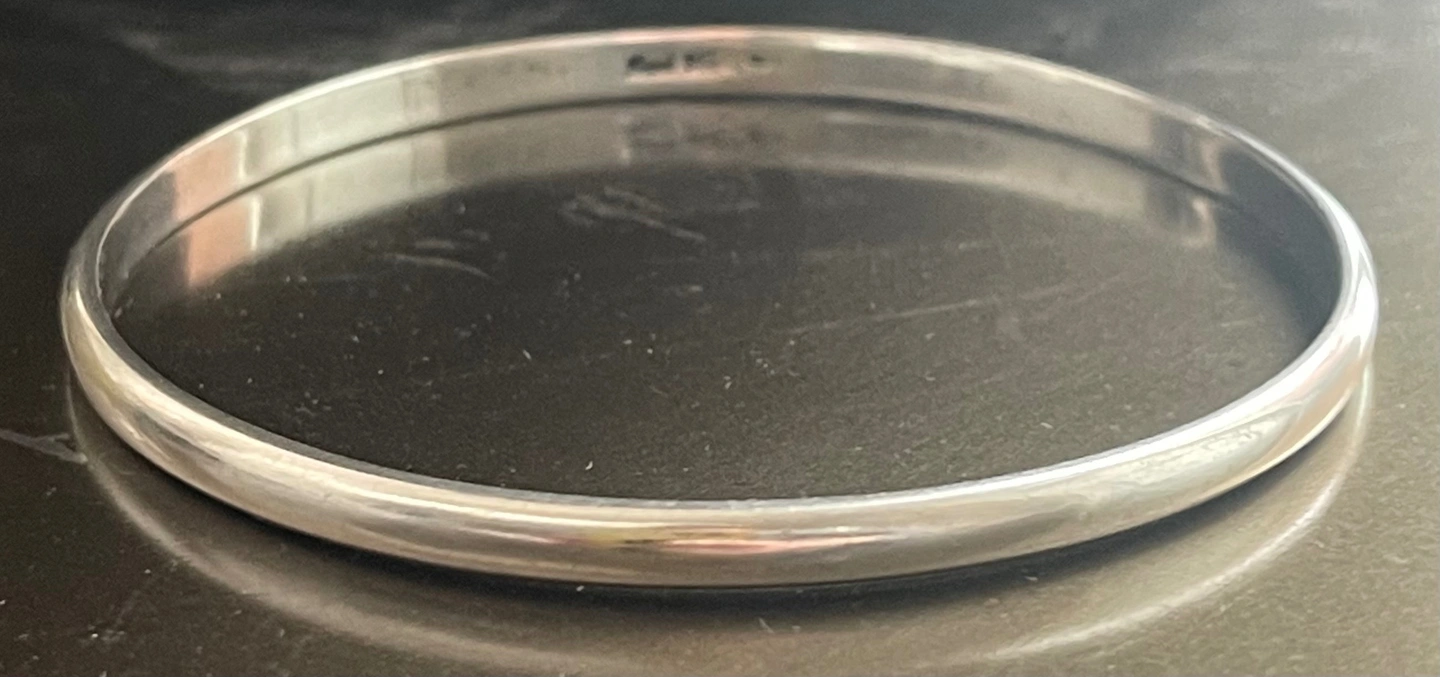 Fit: This is a solid bangle with no clasp. The internal diameter is approx 2 5/8 inches (6.7 cm), which is a common medium-to-large size.