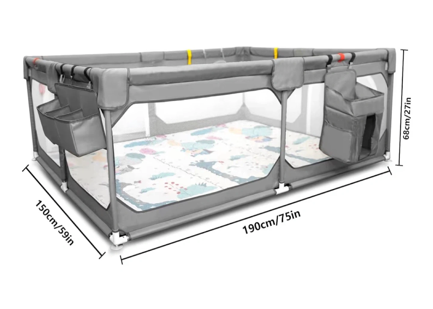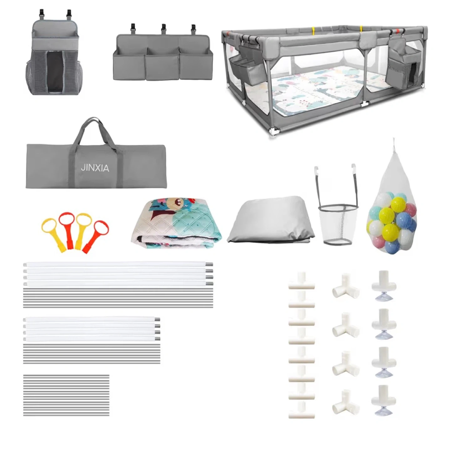 This JINXIA playpen measures 190cm x 150cm x 68cm. It includes storage organizers, a play mat, and a carrying bag. Comes with ball pit balls and a hanging toy basket. Perfect for keeping little ones safe and entertained!