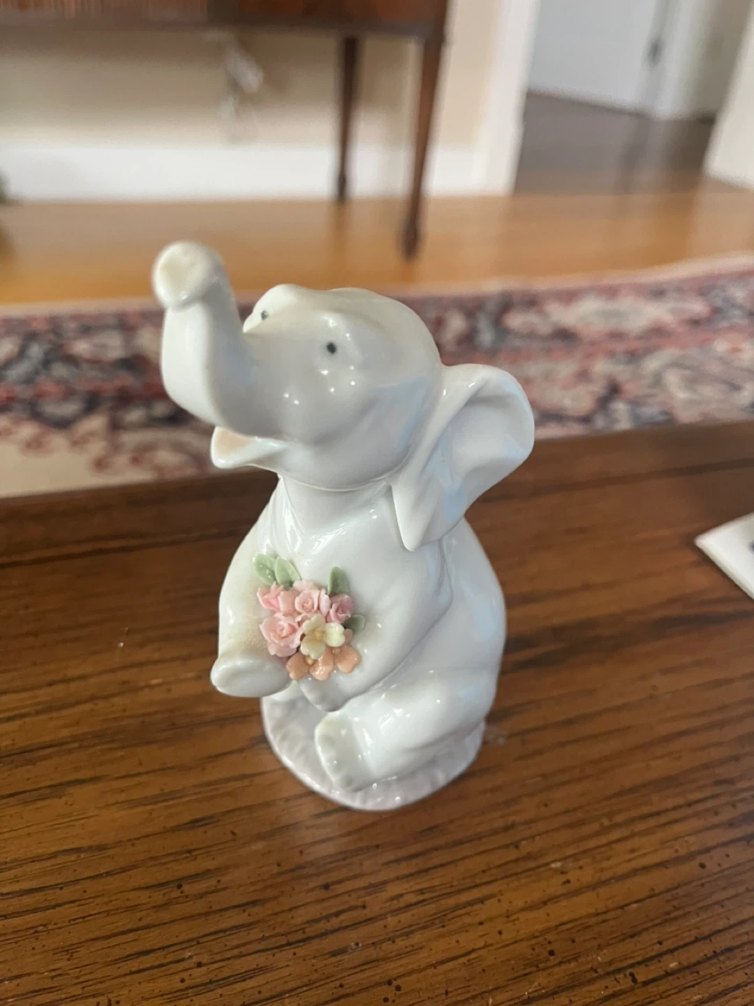 Vintage retired Lladro. Charming white elephant figurine holding a small bouquet of pastel-coloured flowers.