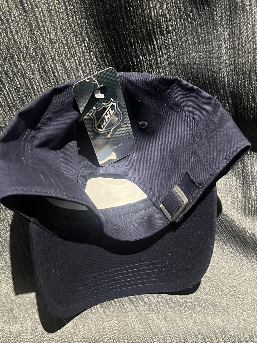 Navy blue Edmonton Oilers baseball cap with official NHL tag. Features embroidered Oilers logo on the front and an adjustable strap for a comfortable fit.