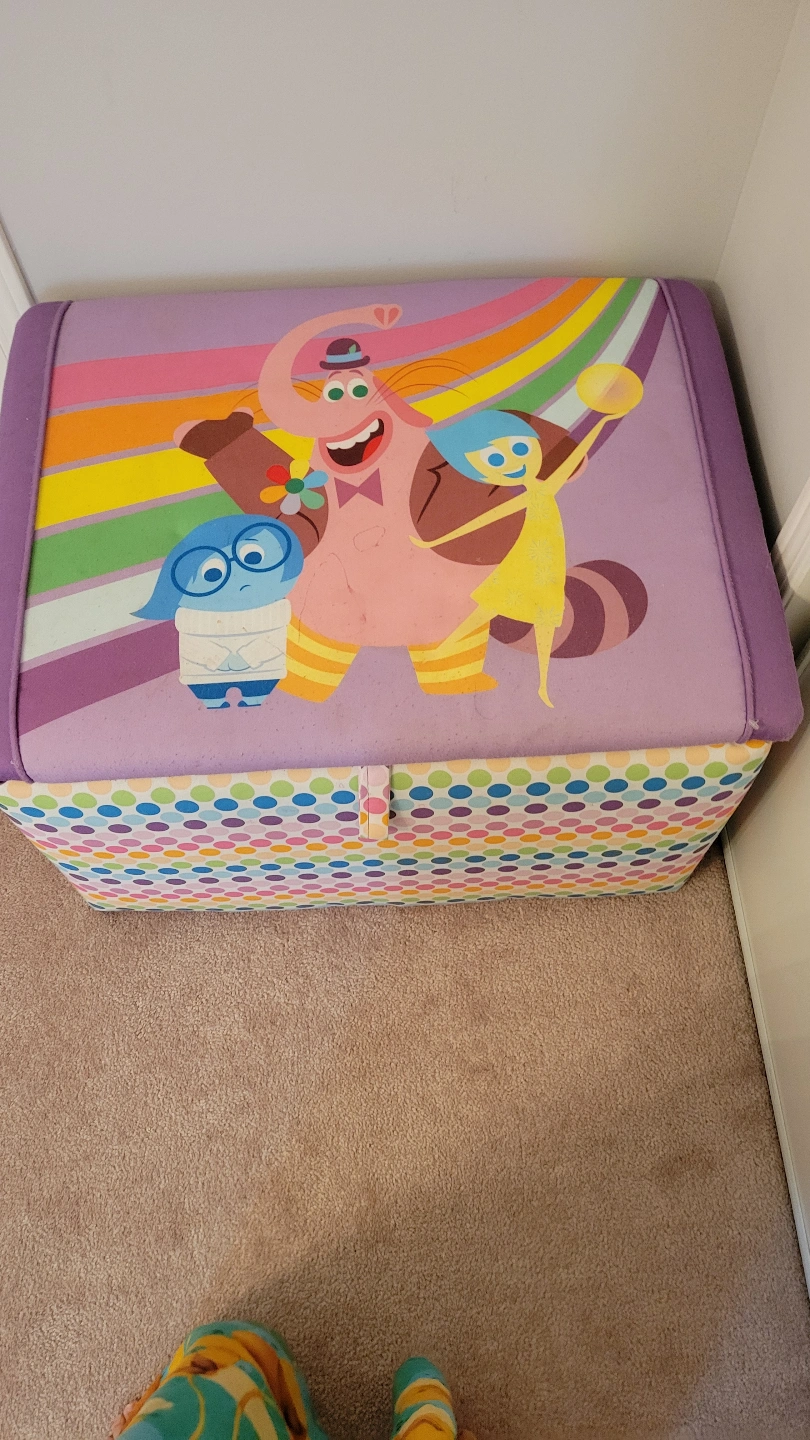 Adorable Inside Out themed toy chest. Great for storing toys or blankets. Offers ample storage space. Ready for pickup. Minor marker marks.