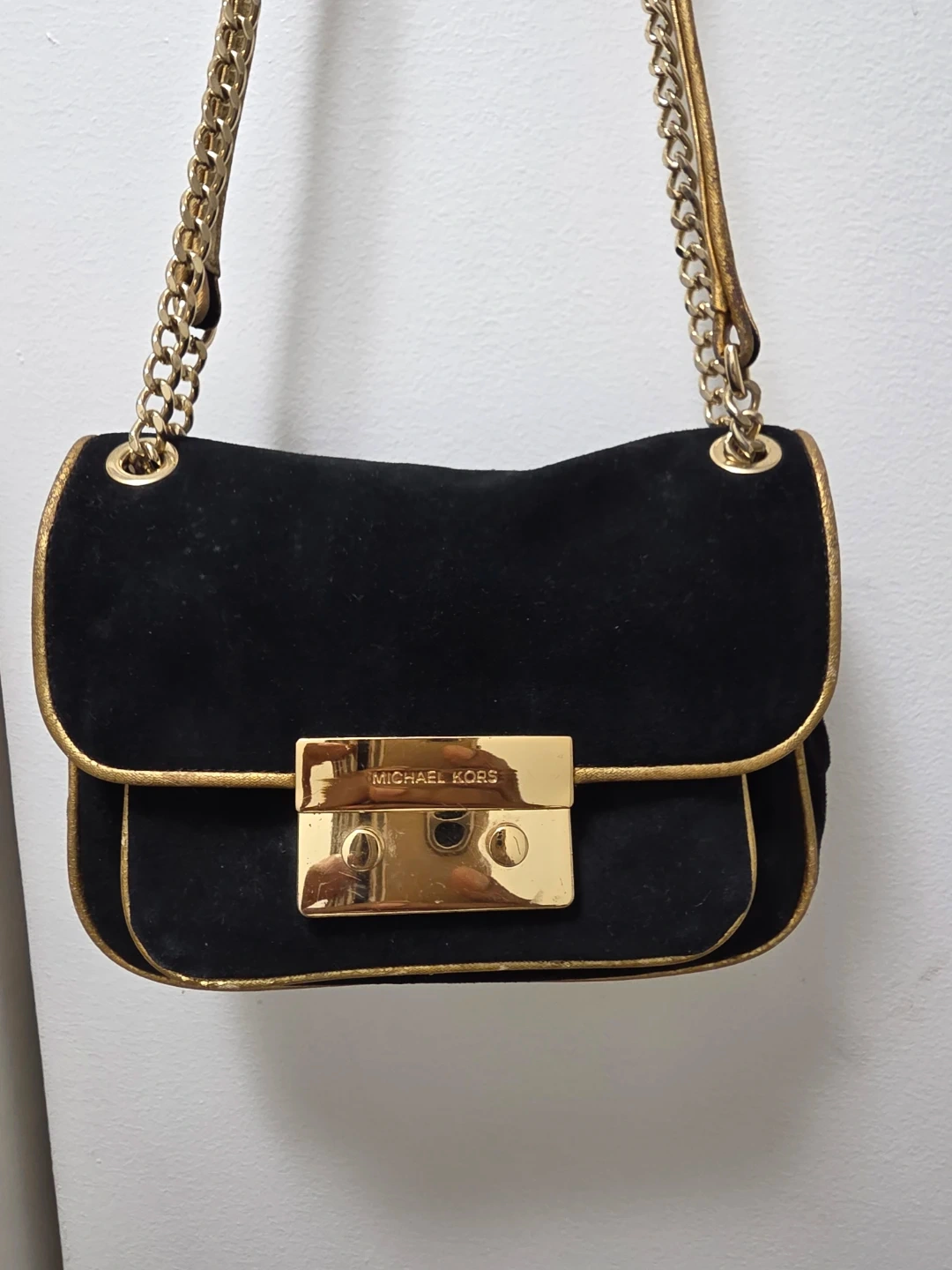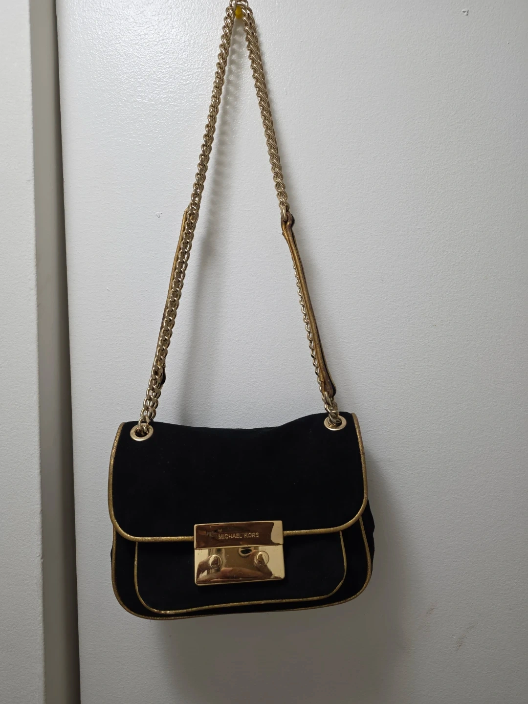 This authentic rare find Michael Kors shoulder bag is made of black suede with gold hardware. It features a turn-lock closure and a decorative chain strap. The interior is lined with branded fabric and has a zippered compartment.