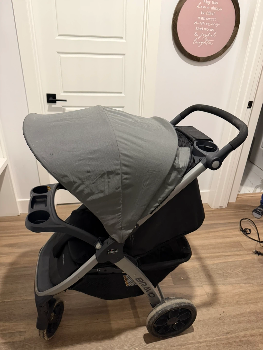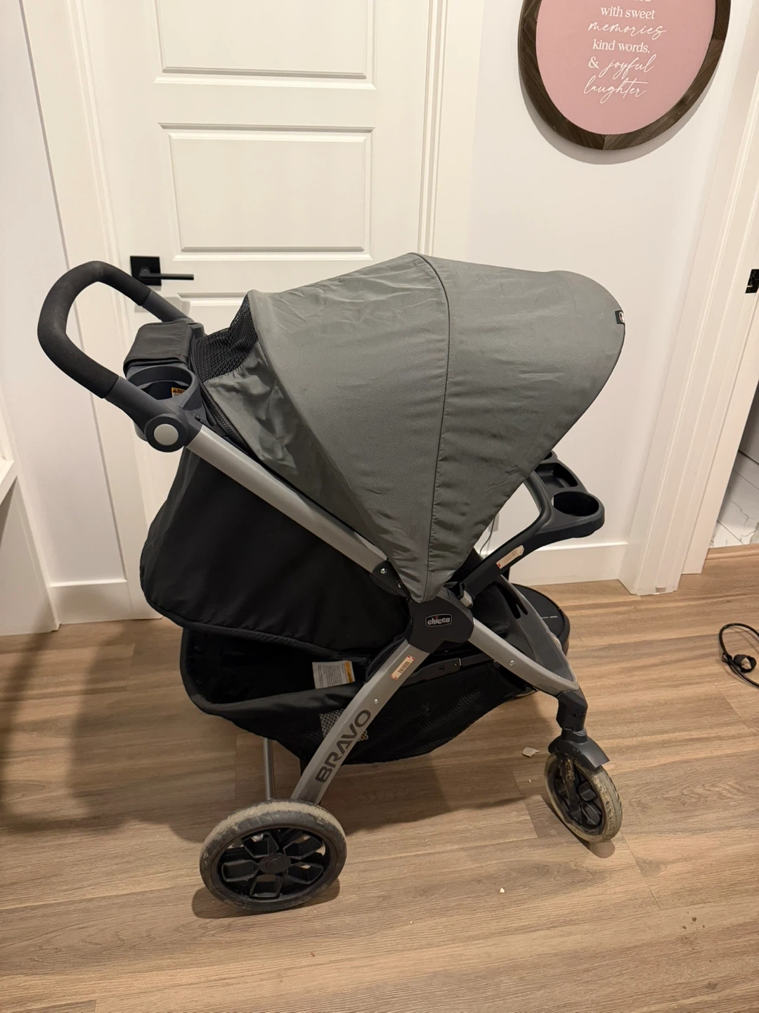 This Chicco KeyFit 30 infant car seat clicks into the Bravo stroller for a convenient travel system. The car seat is black with grey and orange accents. The stroller is also black and grey.