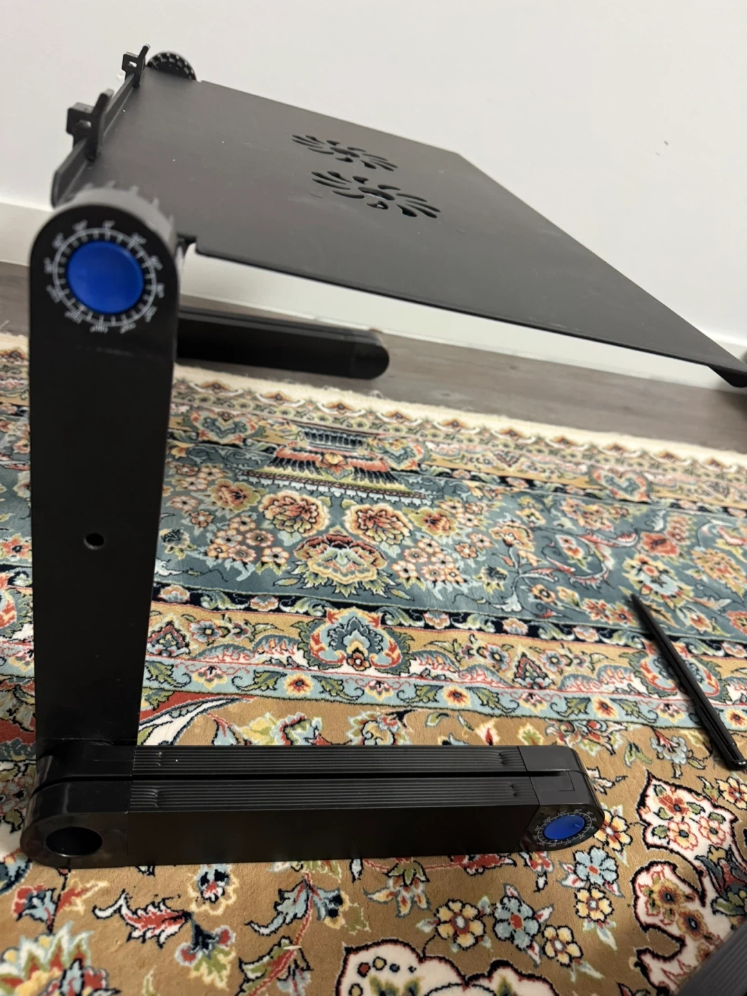 This adjustable black laptop stand features built-in cooling fans to help keep your device from overheating. It's designed with adjustable legs for optimal viewing angles and portability. The stand is made of durable metal.