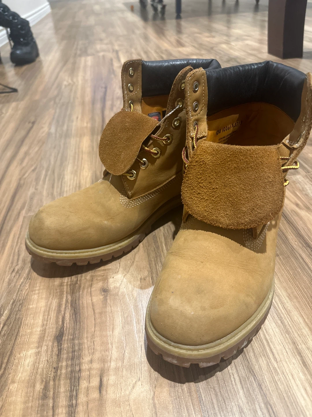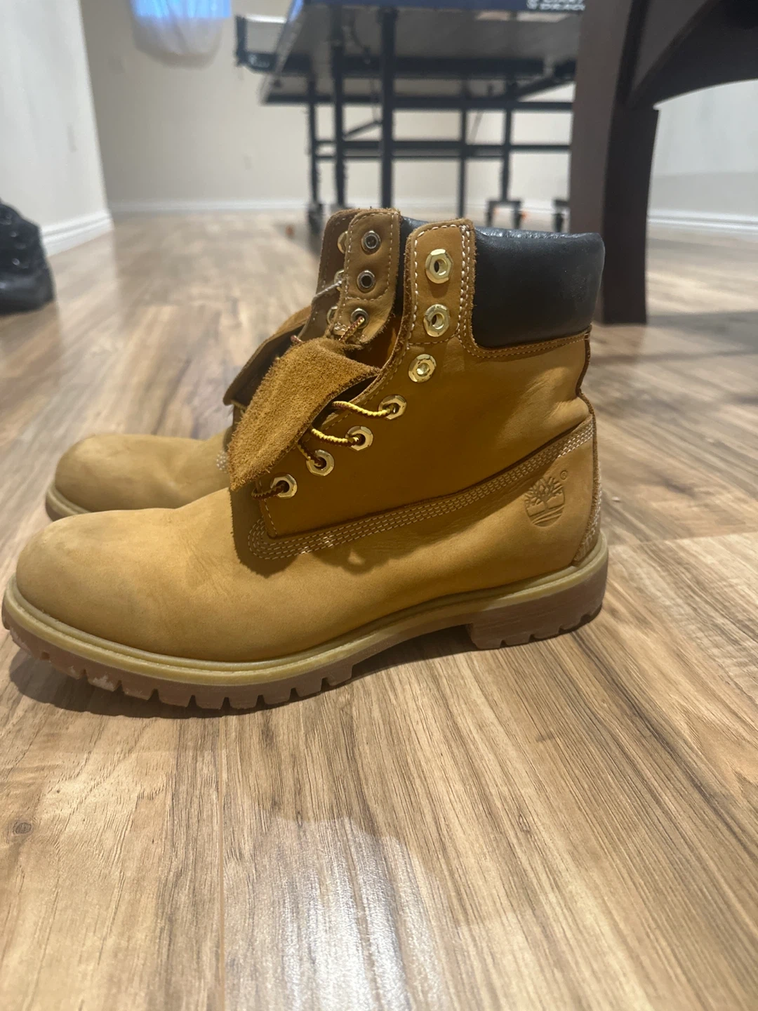 Classic tan Timberland waterproof boots. These boots are made with nubuck leather and have a rubber sole. They offer excellent ankle support and are built to last.