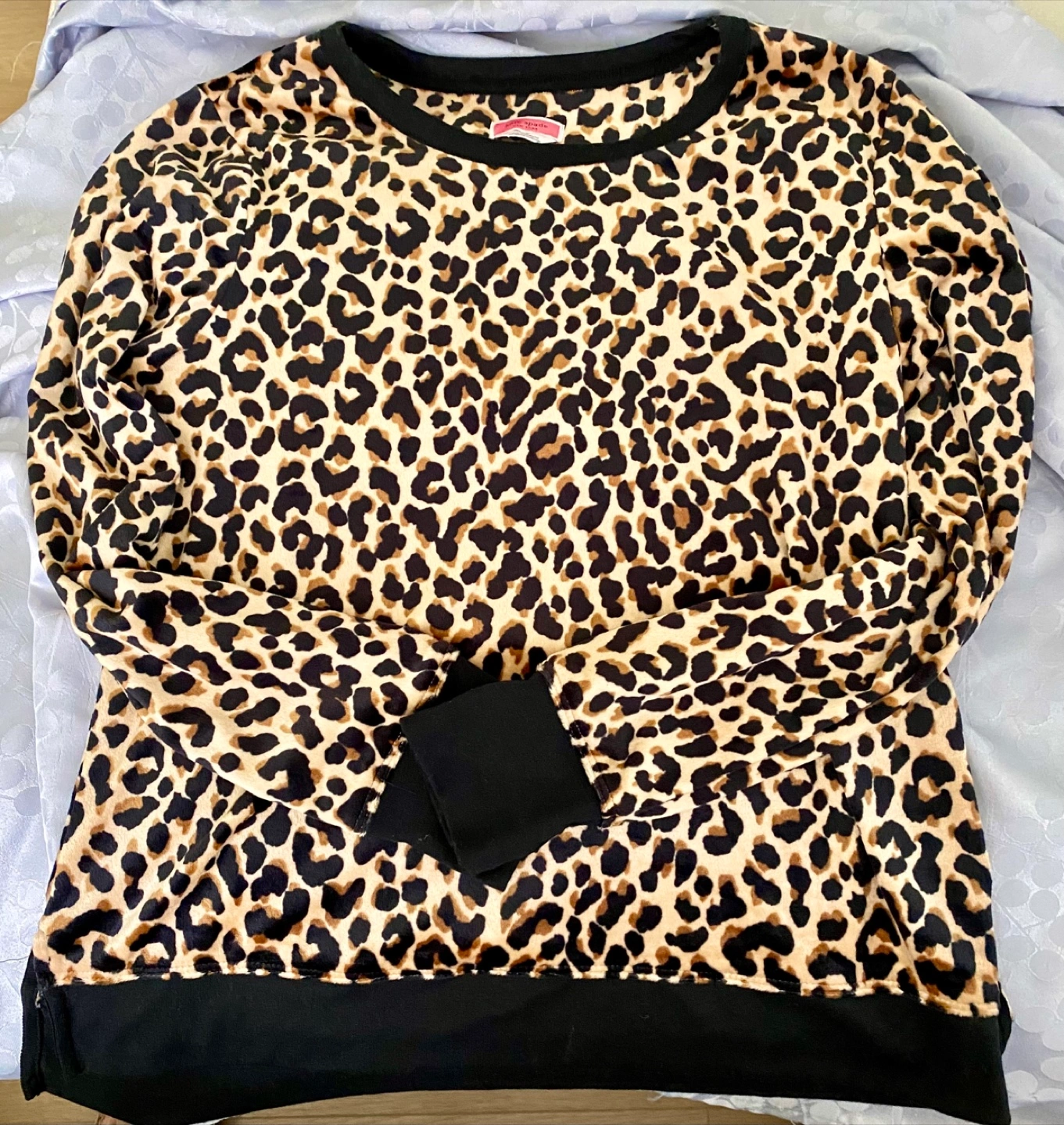 Kate Spade long sleeve leopard print top with black cuffs and hem, a nice contrast to the overall design. It's never been worn.