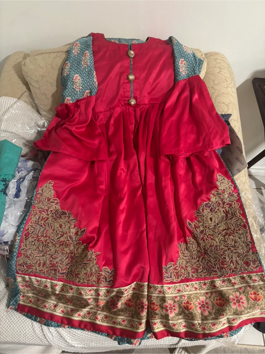 Silk frauq A beautiful dress featuring a vibrant red bodice and a teal patterned back. The dress has intricate gold embroidery along the bottom and a unique design. It's in great condition!