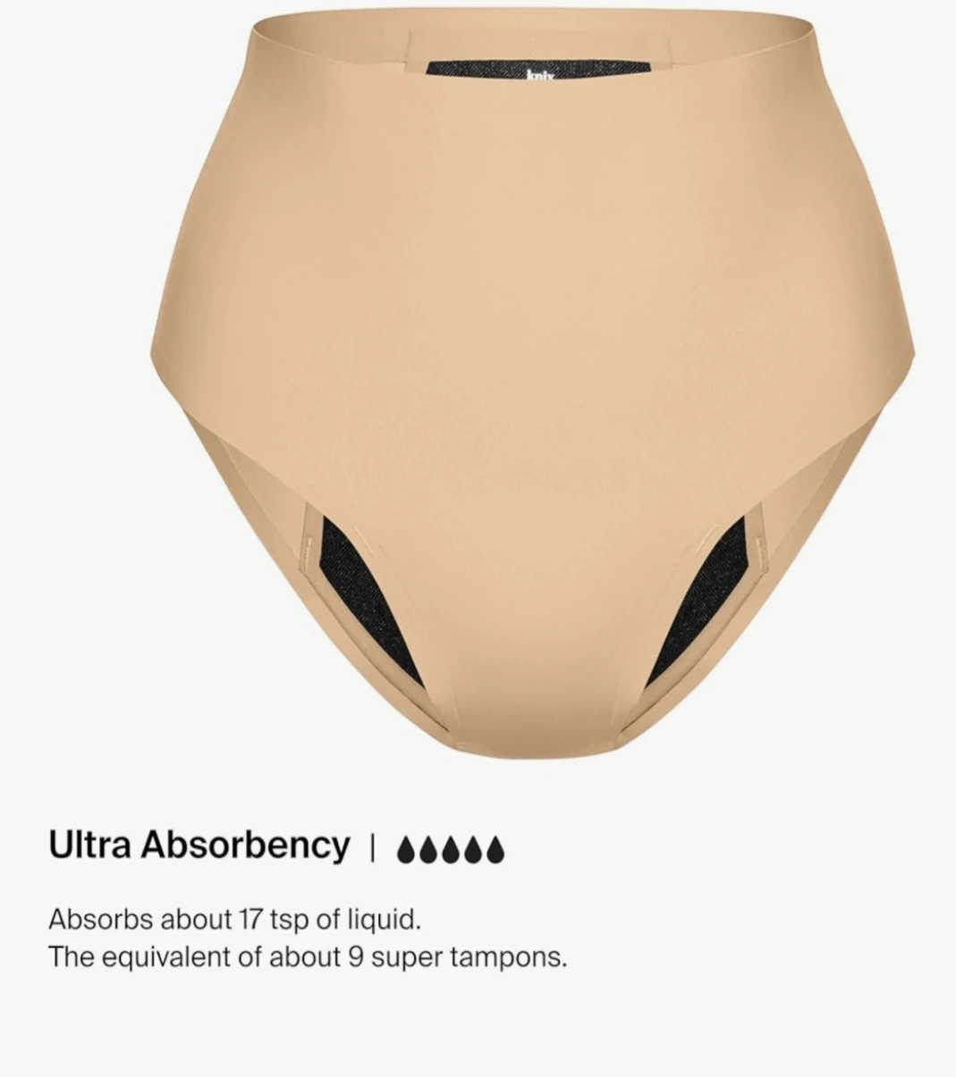This Knix high-rise underwear offers ultra absorbency, absorbing about 17 tsp of liquid. It's designed with extra long protective coverage in the front and back. Washing it is just like regular underwear!
