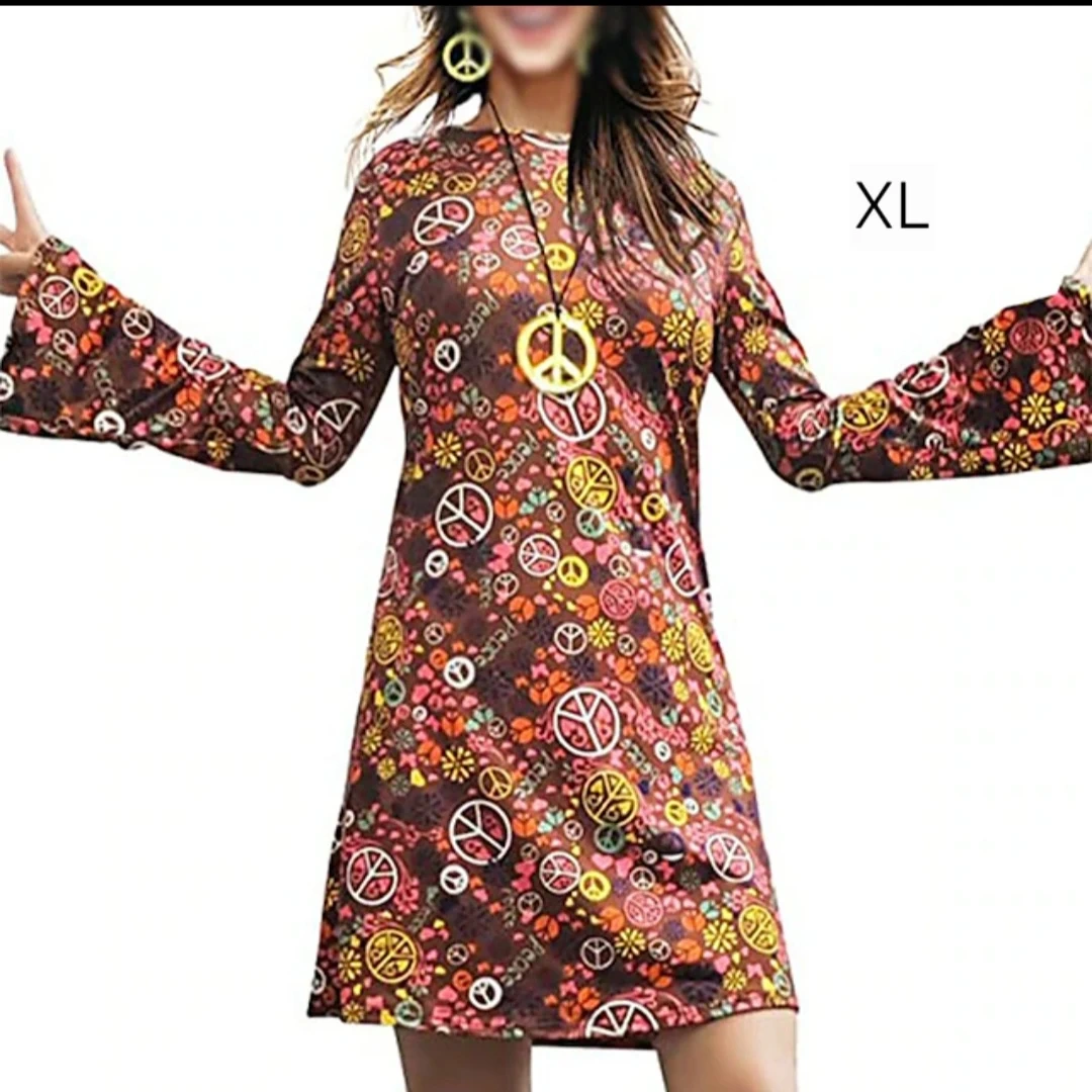 This XL dress features a colourful peace and flower pattern. It's made of a soft and stretchy fabric. It's great for themed parties or casual wear!