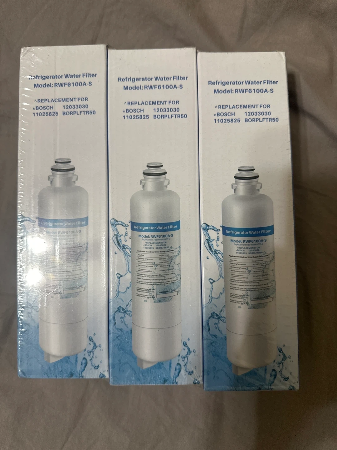 This is a 3-pack of Bosch refrigerator water filters, model RWF6100A-S. It's designed to replace Bosch part numbers 12033030, 11025825, and BORPLFTR50. These filters reduce 99.05% of chlorine and odour for better tasting water. Replace every 6 months for optimal performance.