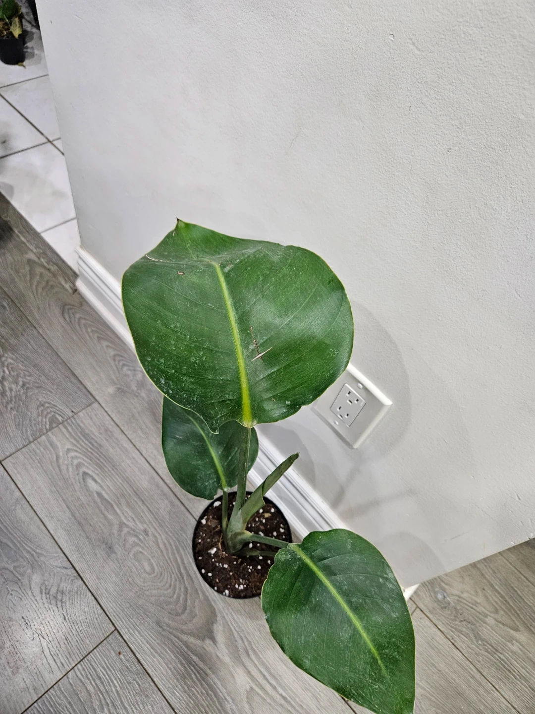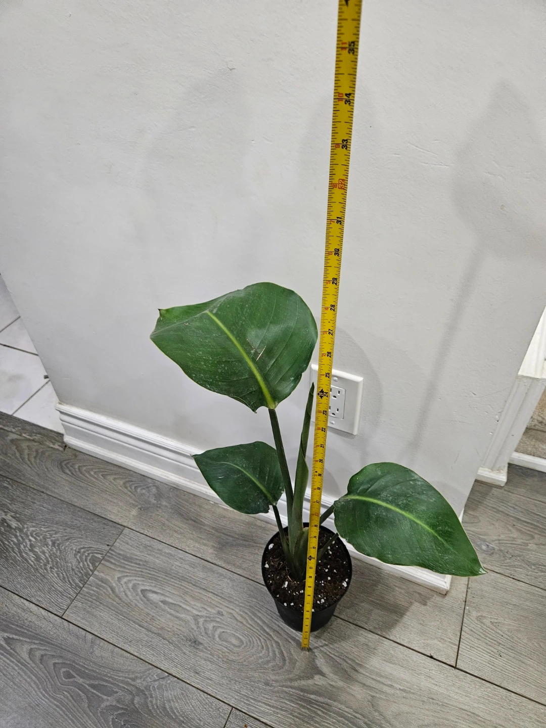 Healthy Bird of Paradise plant in a black pot. It's about 20 inches tall with large, lush green leaves and a distinctive central yellow stripe. This plant would liven up any indoor space!