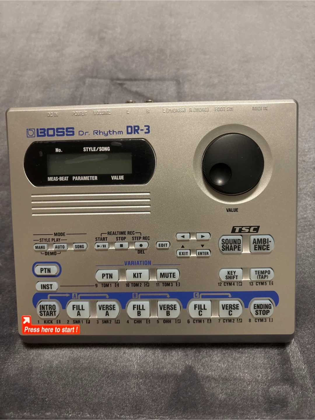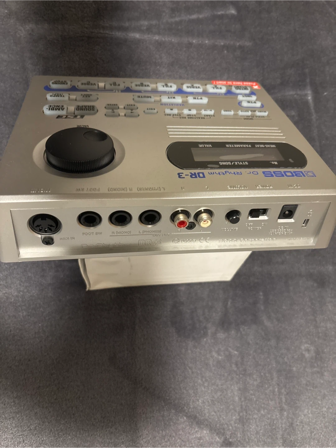BOSS Dr. Rhythm DR-3 drum machine for sale. It features a digital display, various rhythm and pattern controls, and input/output jacks. This unit is ideal for musicians looking to create drum tracks and beats. Comes with BOSS PSA power adapter included.