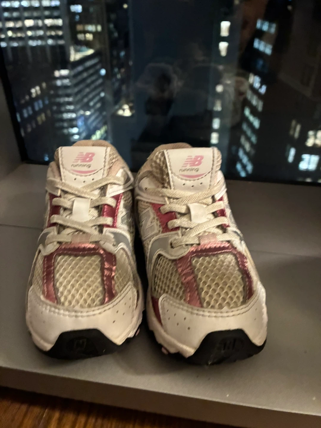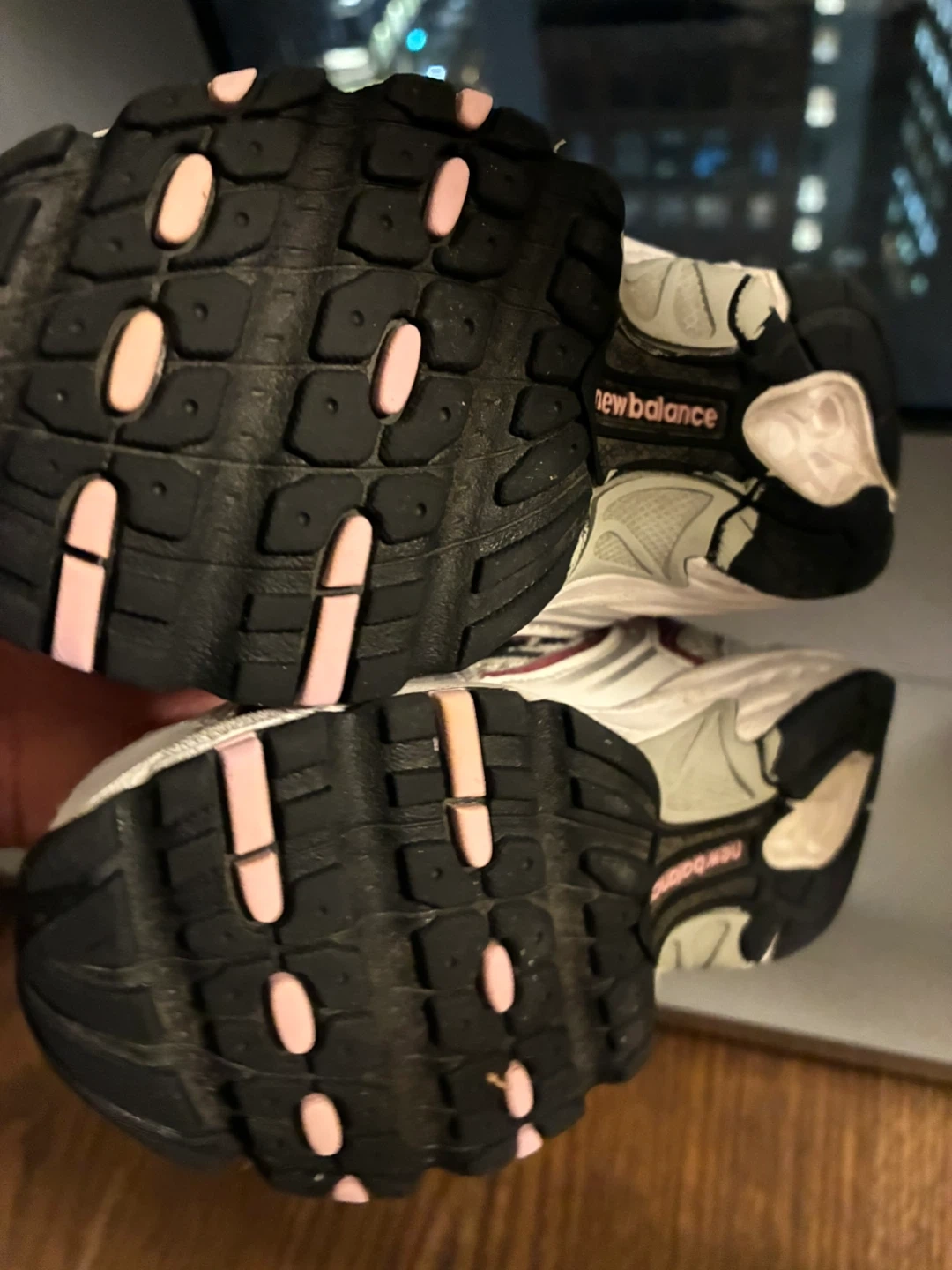 Selling a pair of New Balance running shoes! They have a white and pink color scheme and show some signs of use, as seen in the photos. Great for everyday wear.