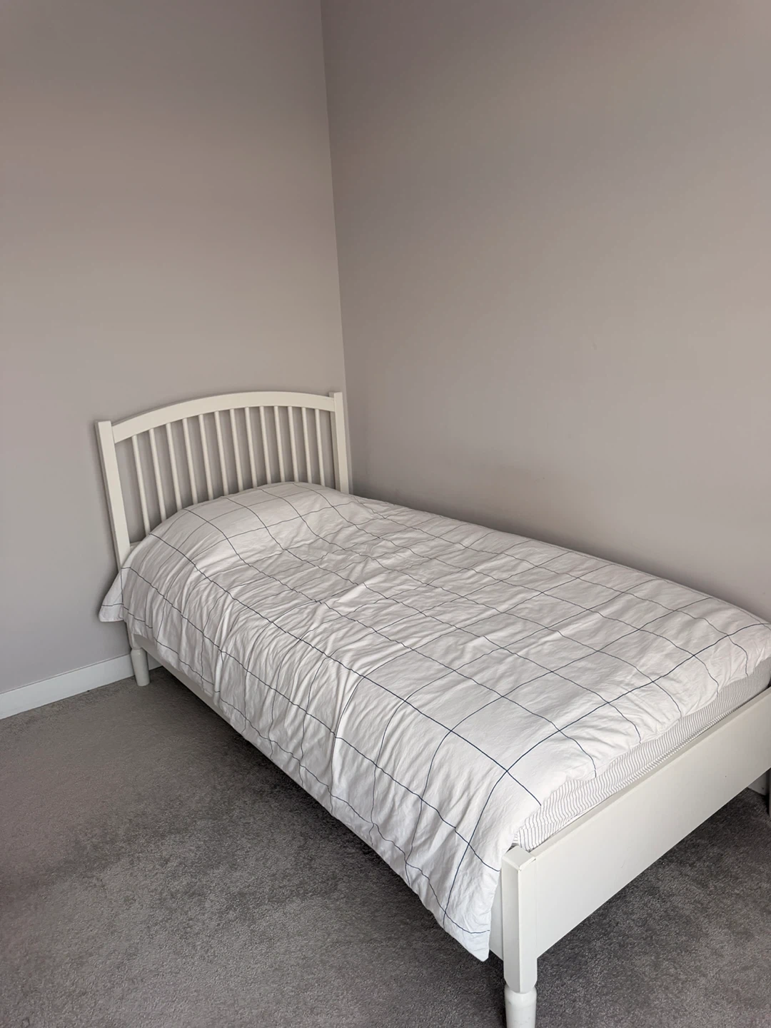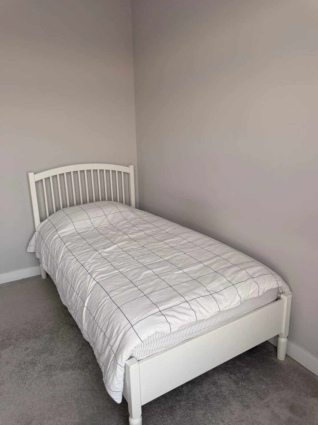 A clean white twin bed frame. It features a classic slatted headboard design. Made of sturdy wood construction. Comes with mattress as well