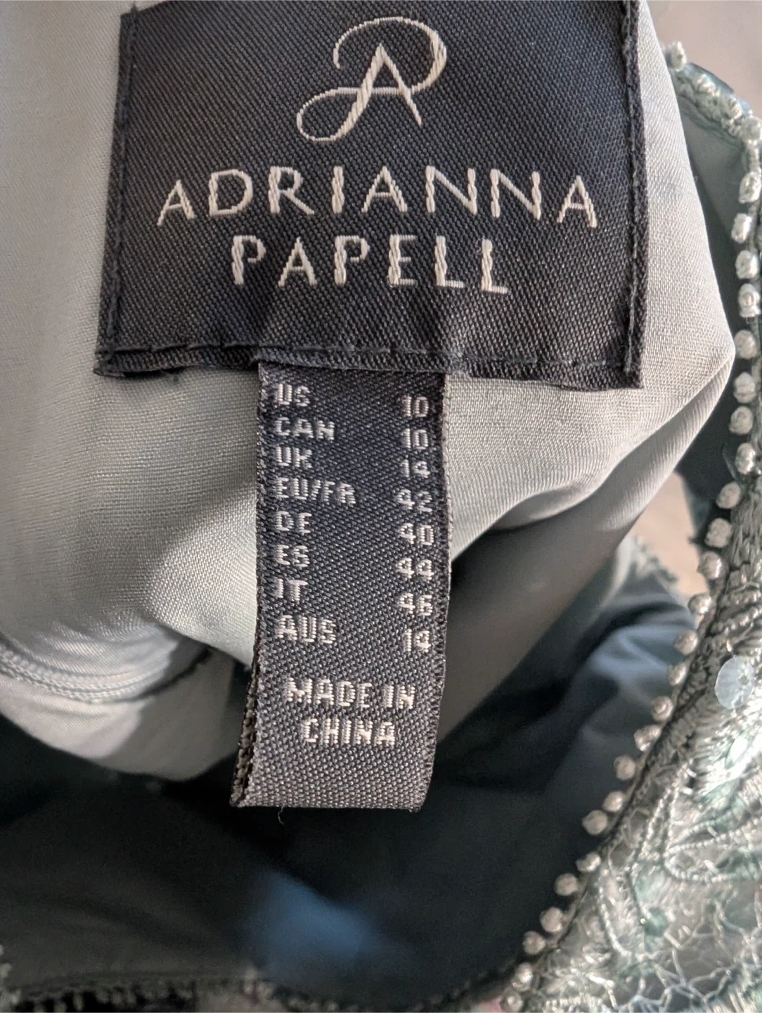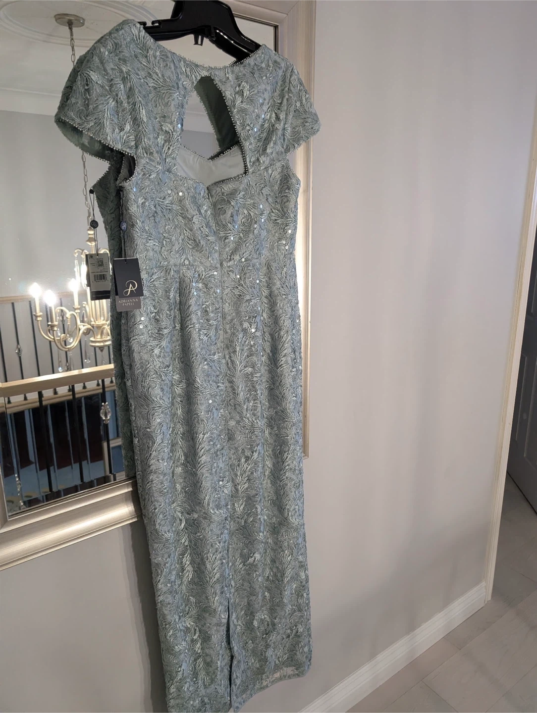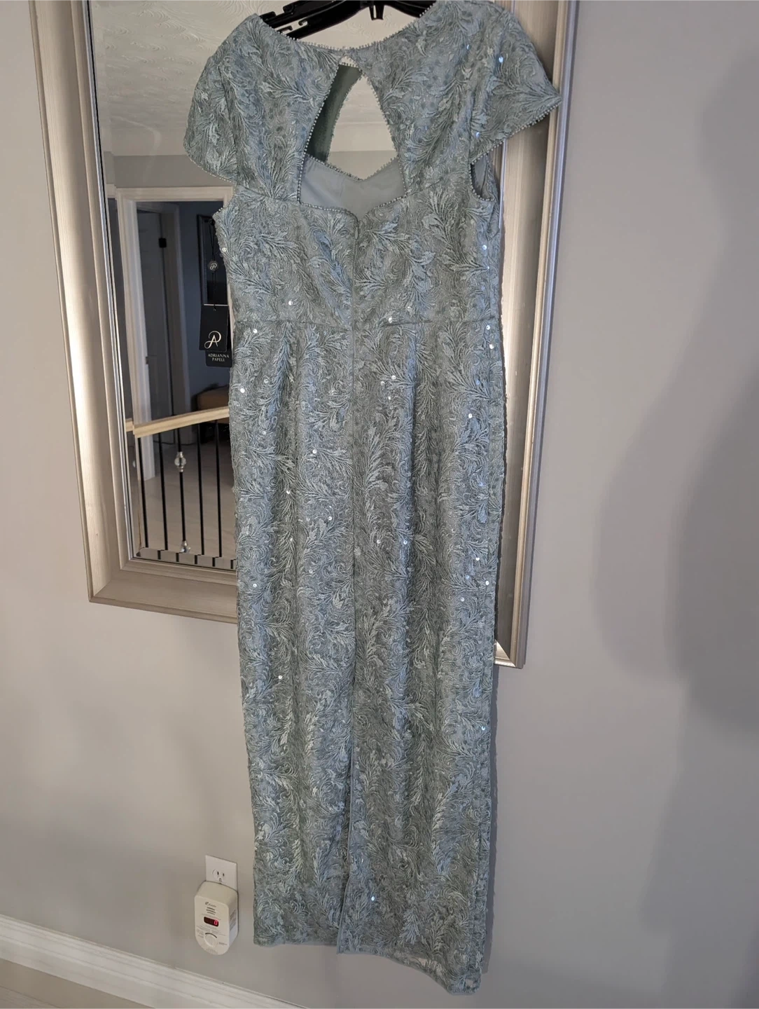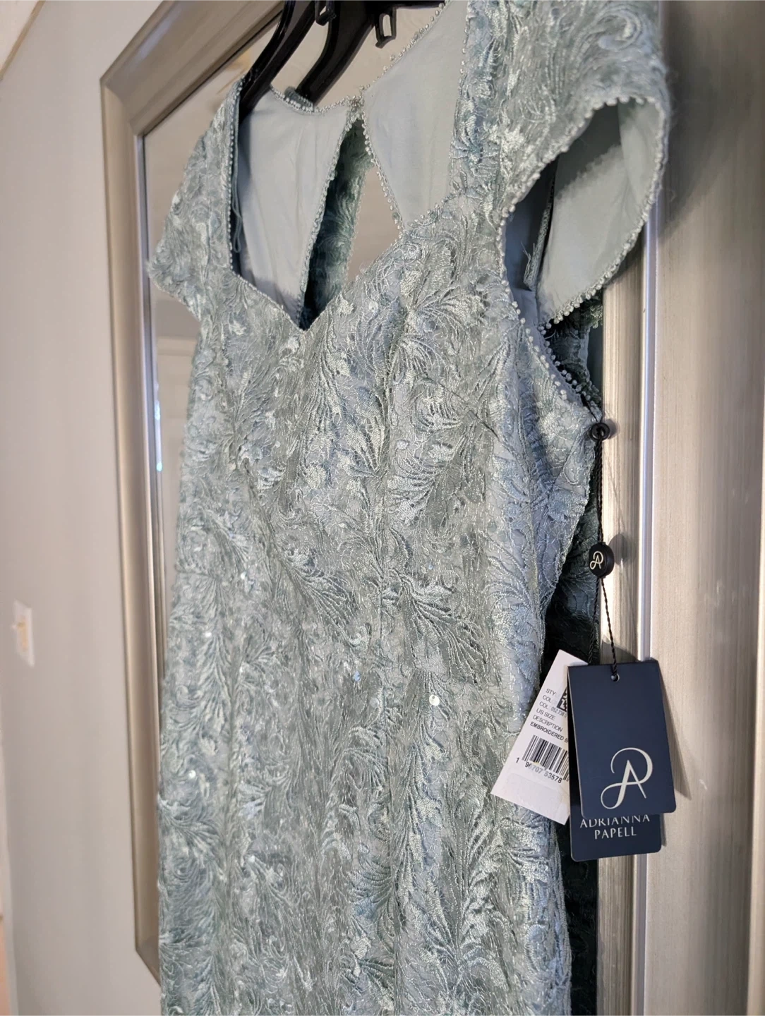 This elegant Adrianna Papell dress features a delicate lace overlay with subtle beading. It has short sleeves and a flattering silhouette. Perfect for a formal occasion!
