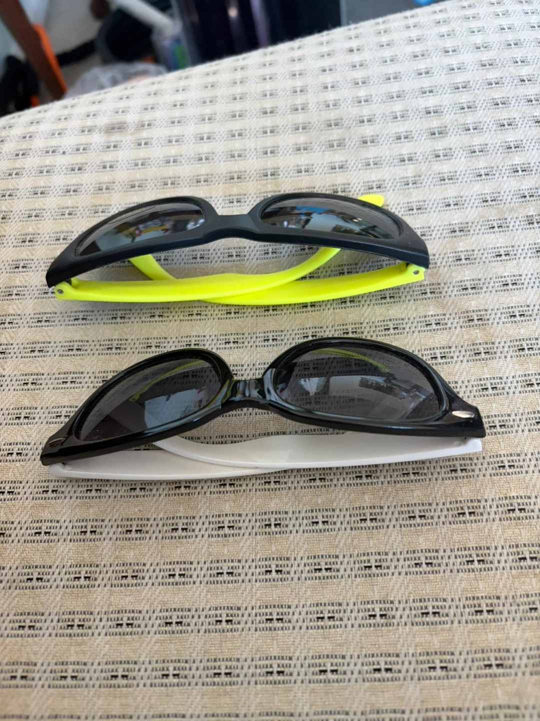 Two pairs of sunglasses included. One black pair with clear lenses and one black pair with neon yellow arms. Both offer UV 400 protection. Great for sunny days!