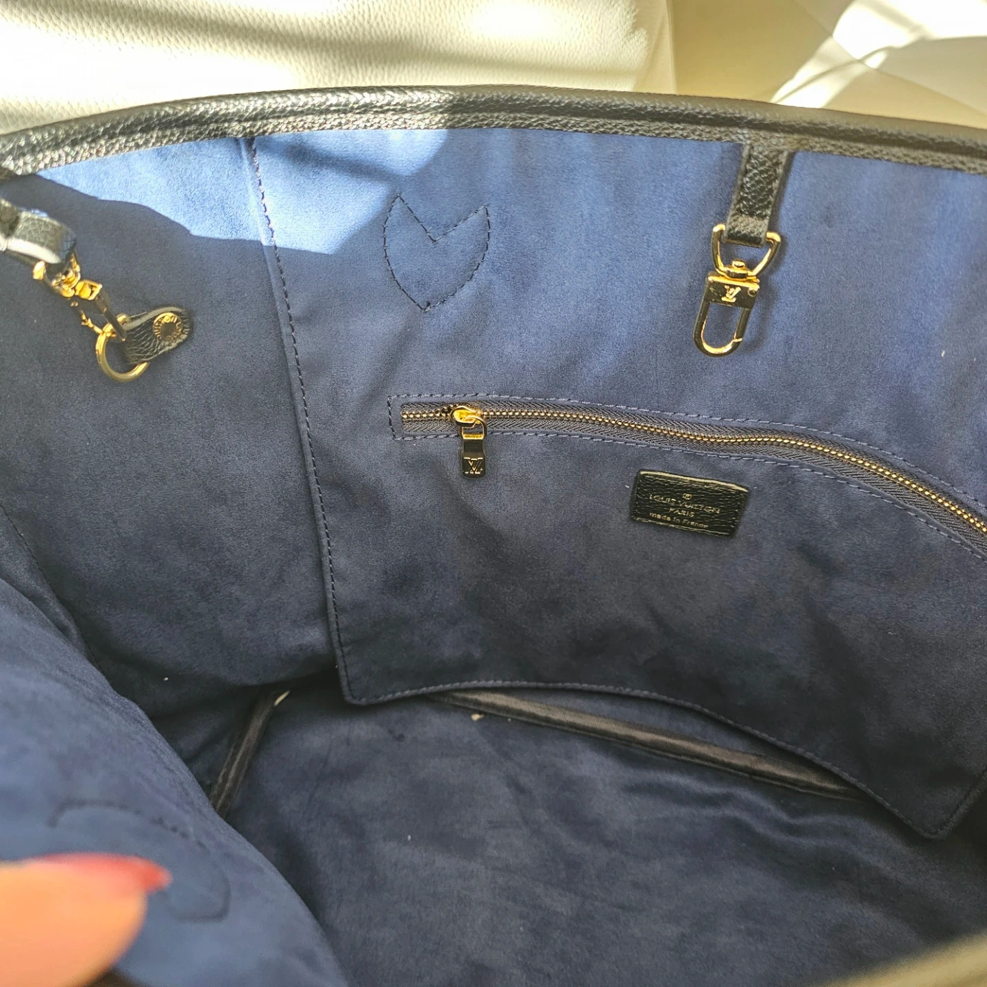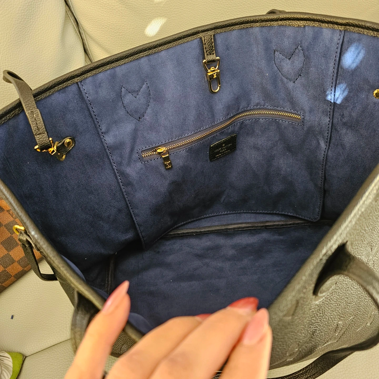 A stylish Louis Vuitton black tote bag crafted from embossed leather. It features a spacious interior and comes with a matching zippered pouch. Made in France.