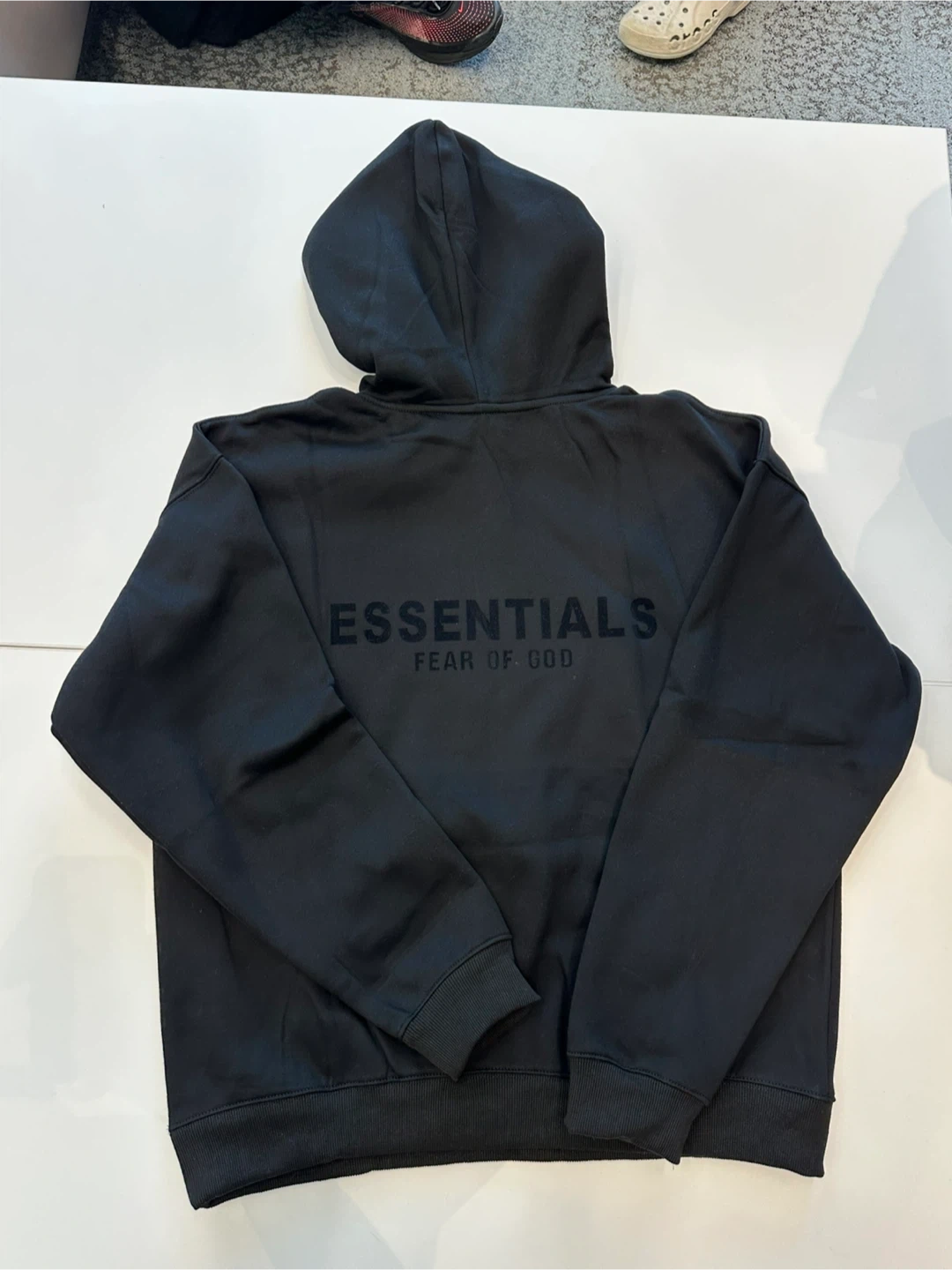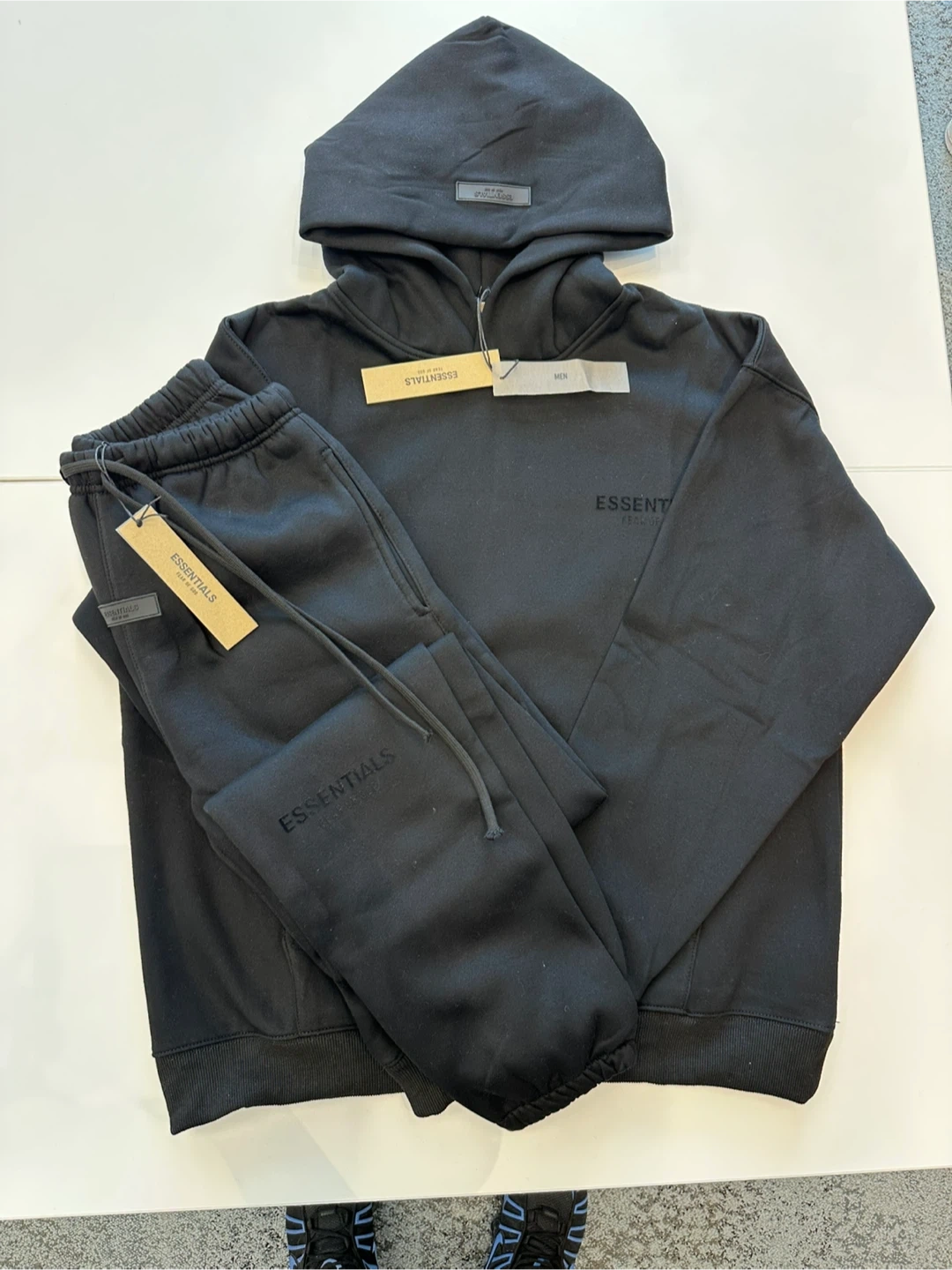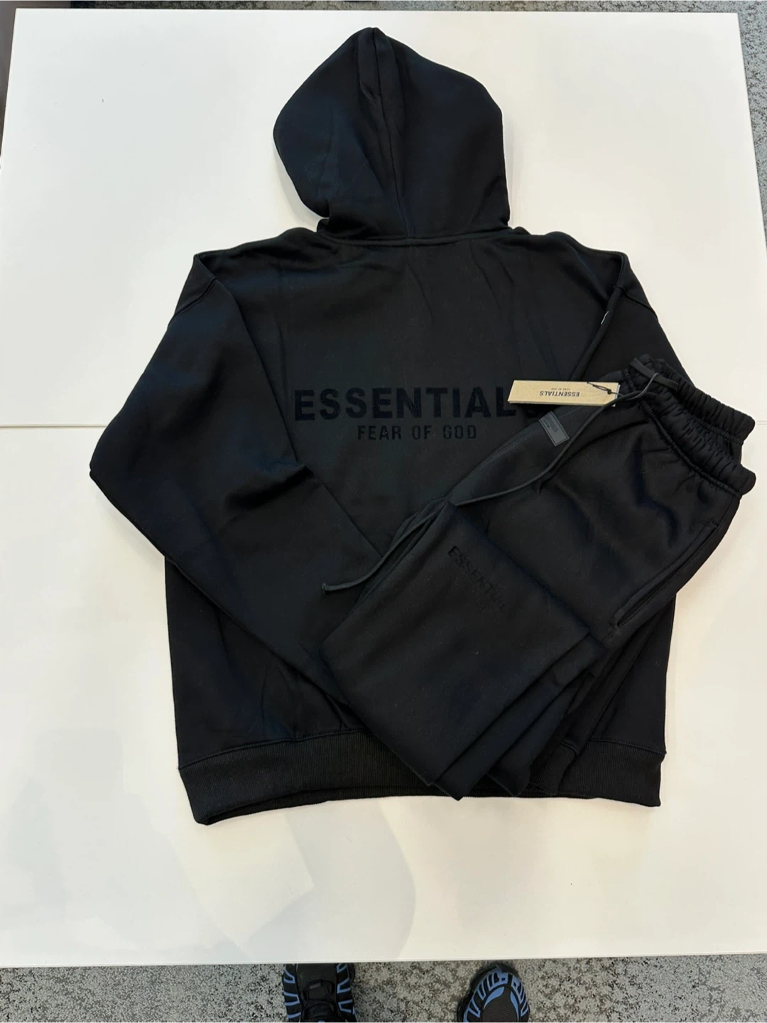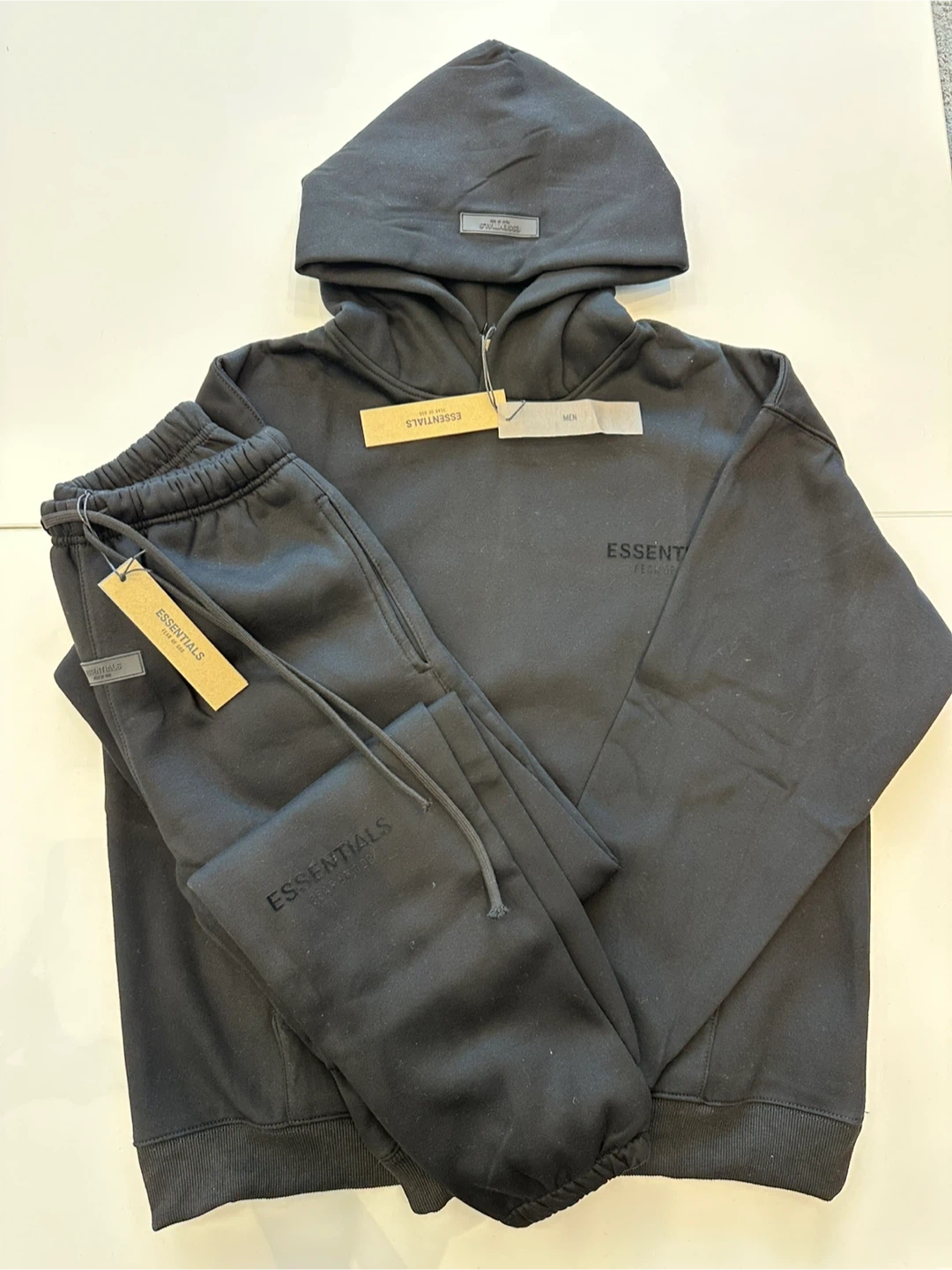 This is a black hoodie and sweatpants set from Fear of God Essentials. It's designed for men and made from a comfortable fabric. The set includes a hooded sweatshirt with a kangaroo pocket and matching sweatpants with an elastic waistband.