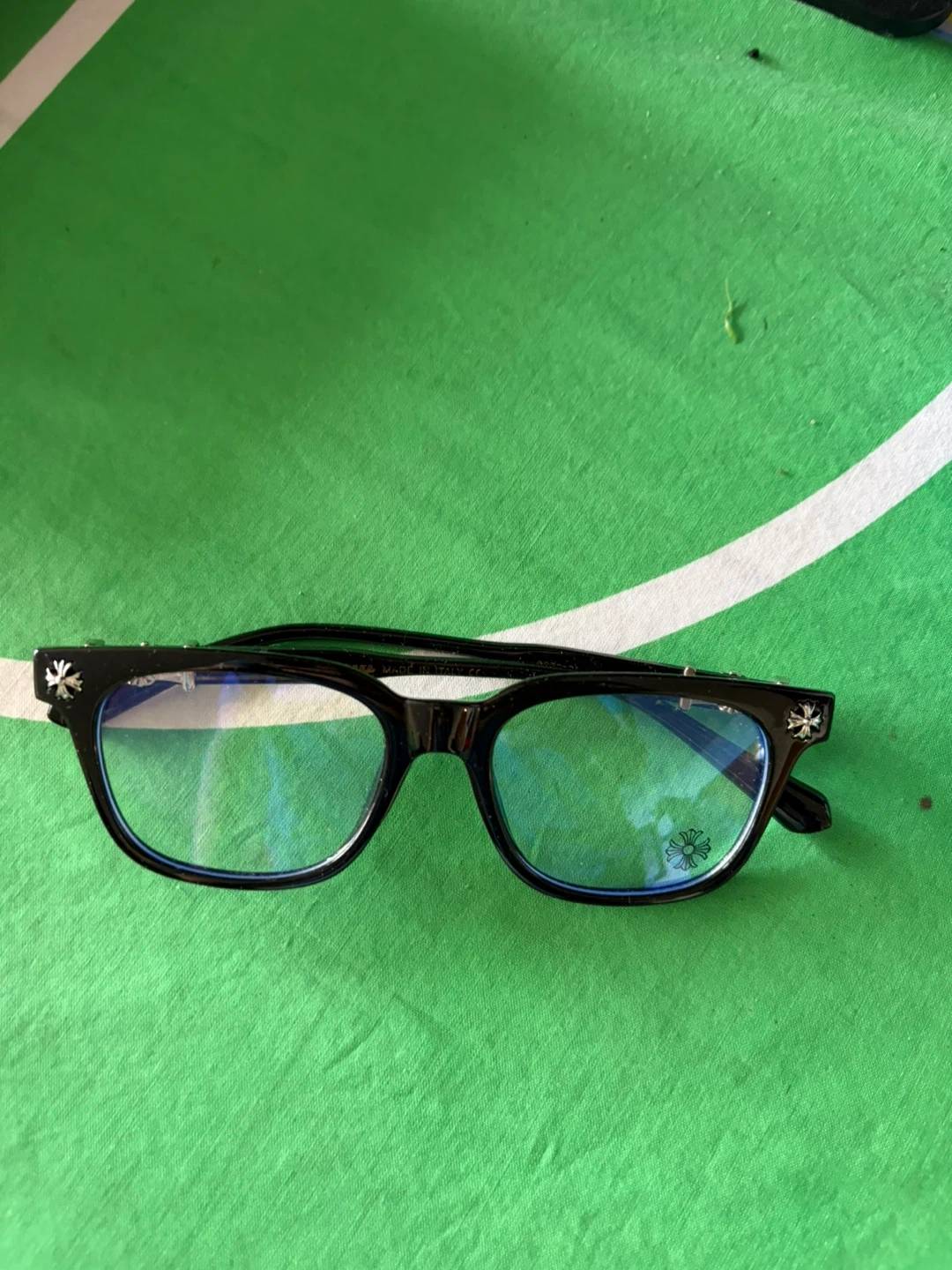 These black Chrome Hearts glasses feature intricate silver detailing on the frames. They're stylish and well-made. Perfect for adding a touch of luxury to your everyday look!