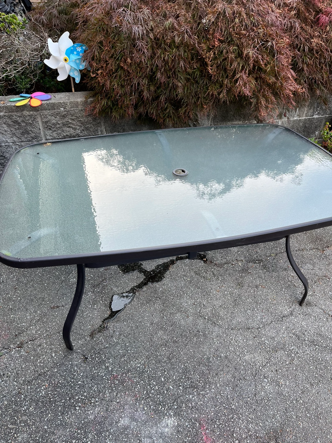 A rectangular glass patio table with a black metal frame. The table has an umbrella hole in the centre. Pick up near Guildford mall in Surrey.