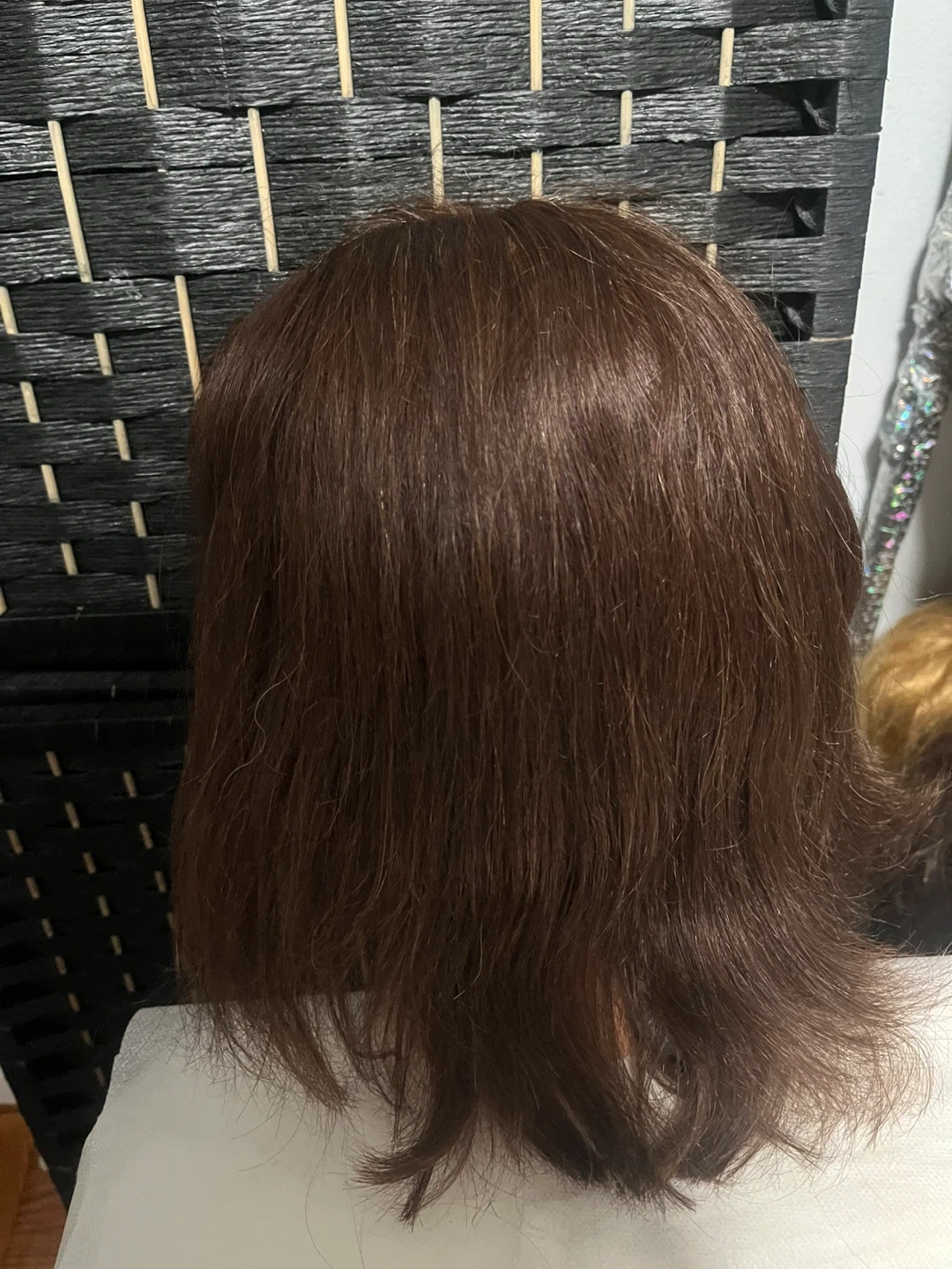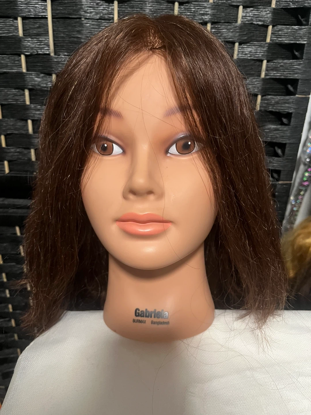 This is a Gabriela training mannequin head with brown hair. It's ideal for cosmetology students or hair stylists practicing cuts, styling, and coloring. The hair is synthetic and approximately shoulder length.
