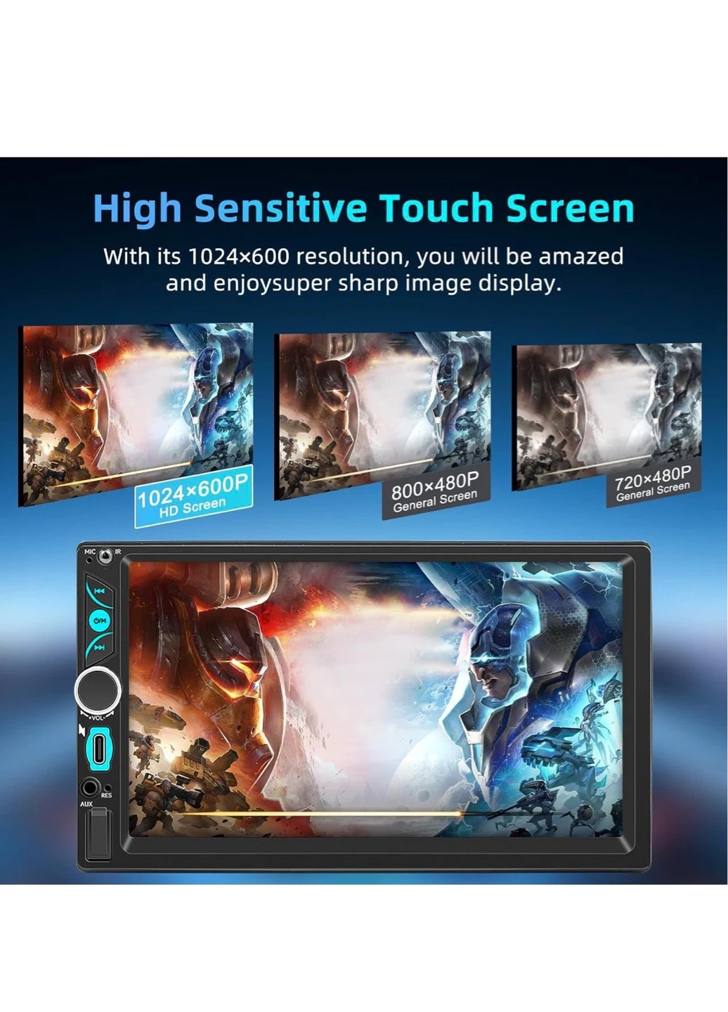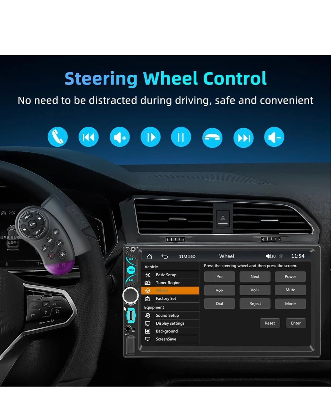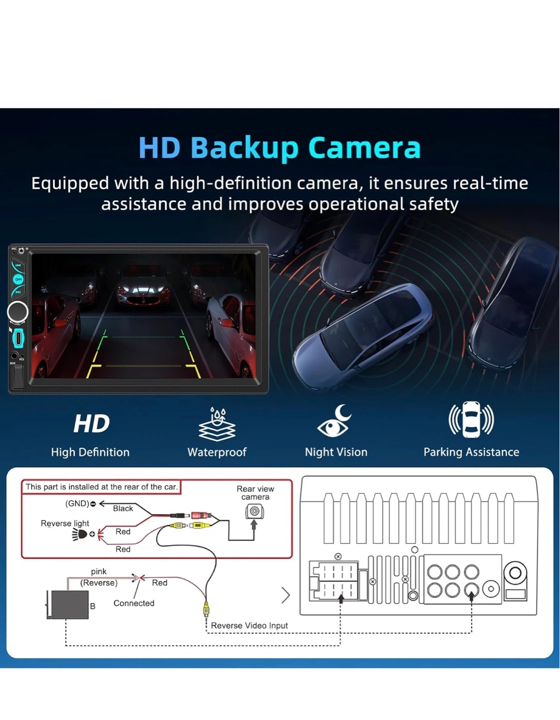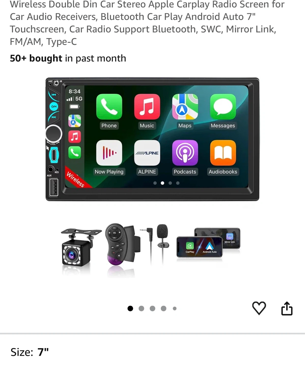 This is a 7-inch double din car stereo with wireless CarPlay and Android Auto support. It includes a touchscreen, Bluetooth, SWC, and mirror link functionality. The unit also comes with an HD backup camera and remote control.