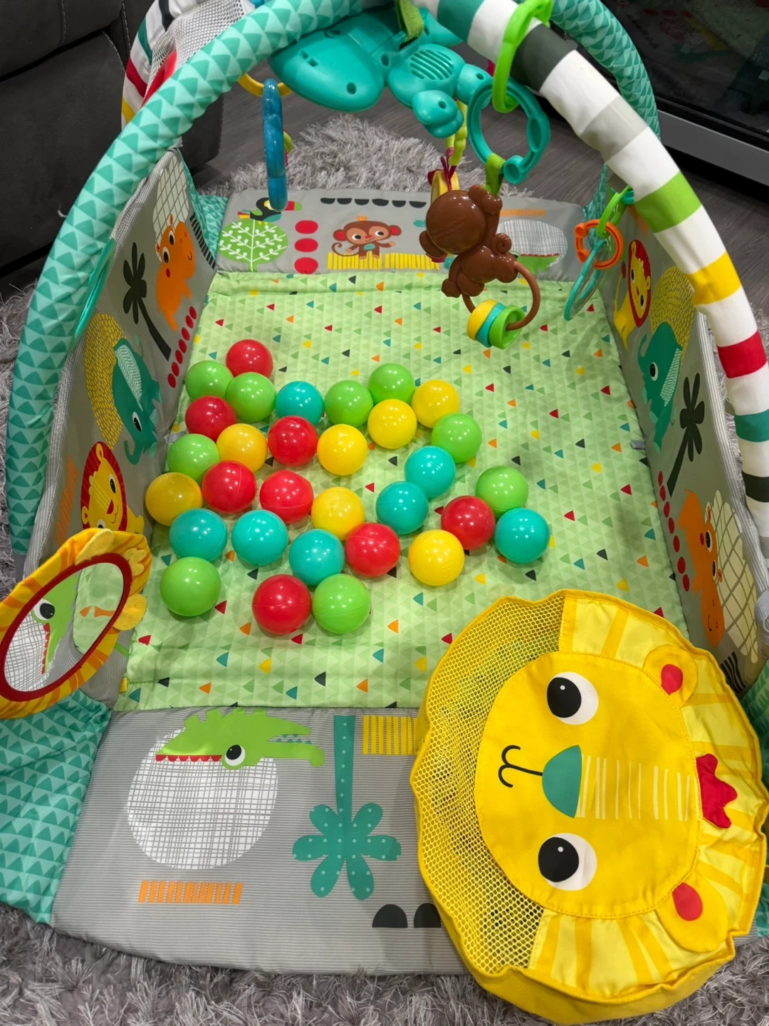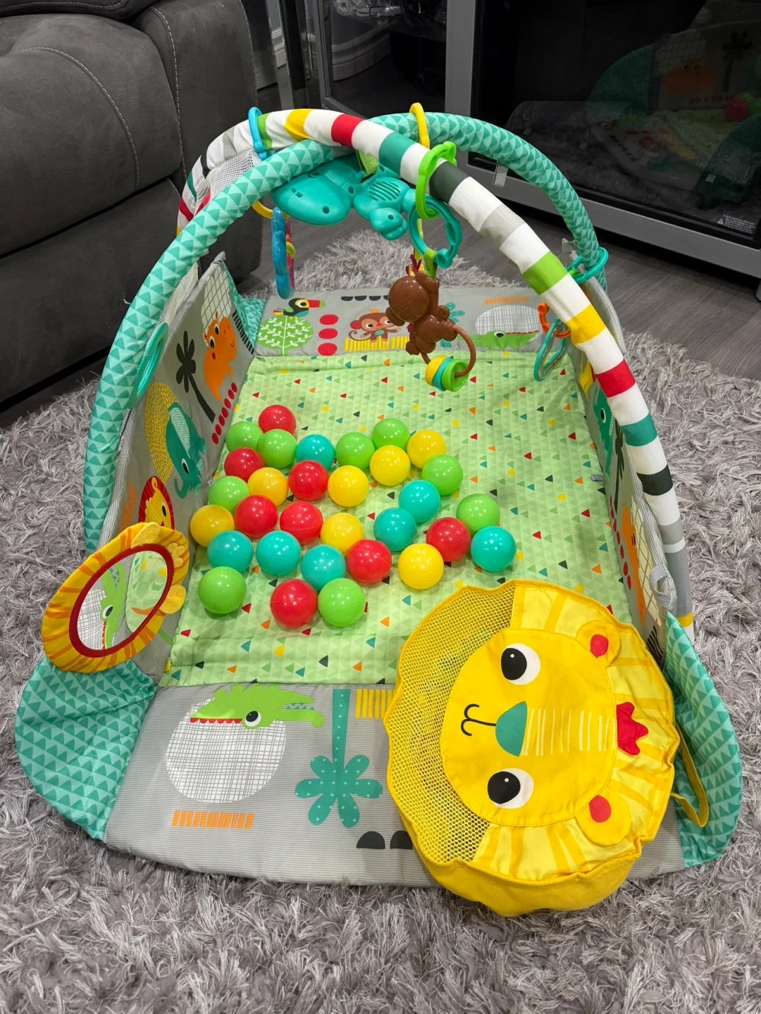 This baby play gym features a soft mat and an overhead arch with hanging toys. It includes a ball pit feature with colourful balls. It's designed for little ones to explore and play. This play gym is great for developing motor skills and sensory exploration.