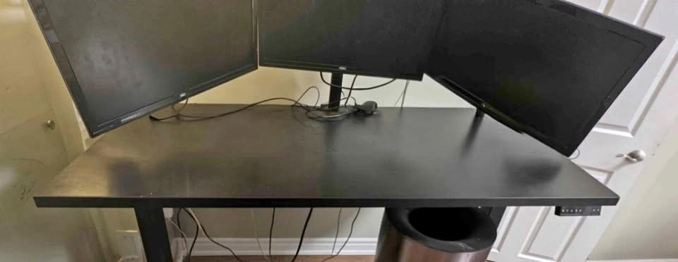 Triple monitor mount. Clamps to desk and provides cable routing. Monitors can be adjusted, tilted, and rotated individually. Comes with 3 24" AOC monitors included (all work perfectly)!!