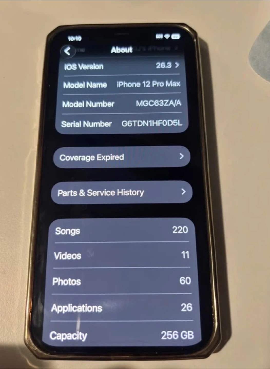 Selling an Apple iPhone 12 Pro Max in gold with 256GB storage. Maximum battery capacity is 82%. It's unlocked with no SIM restrictions.