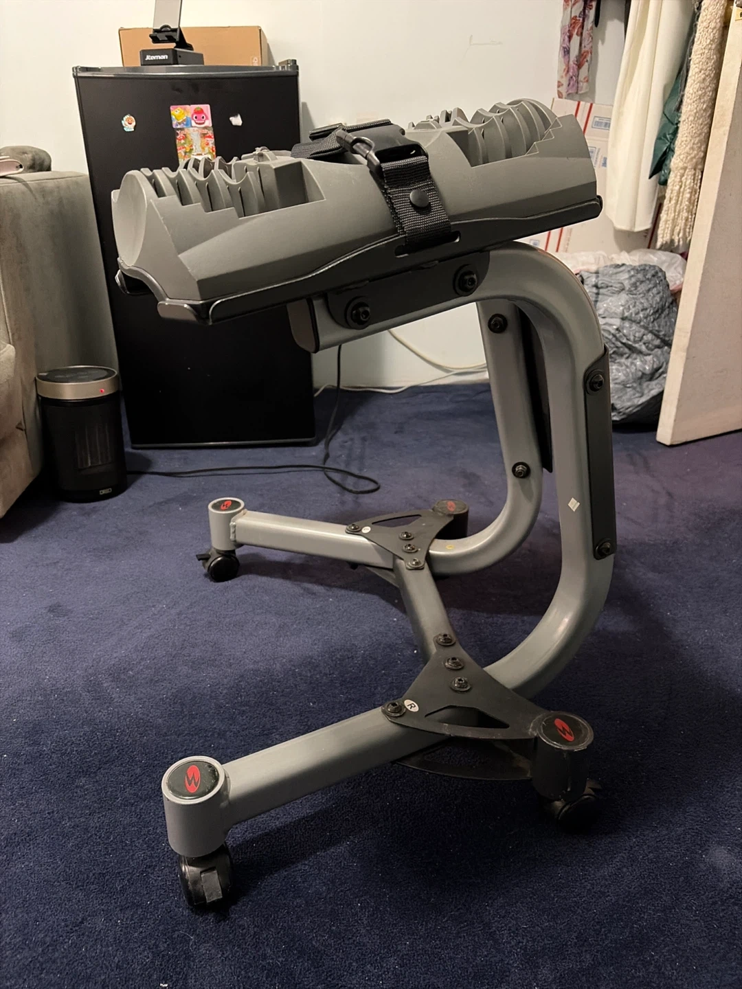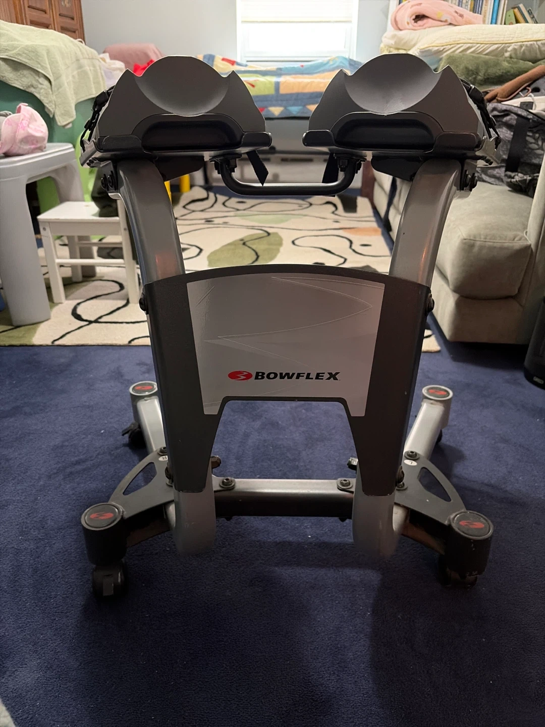 Adjustable dumbbells with rotating weight selection dials. Includes the dumbbell stand. Easy to switch weights for your workout. Great for home gyms!