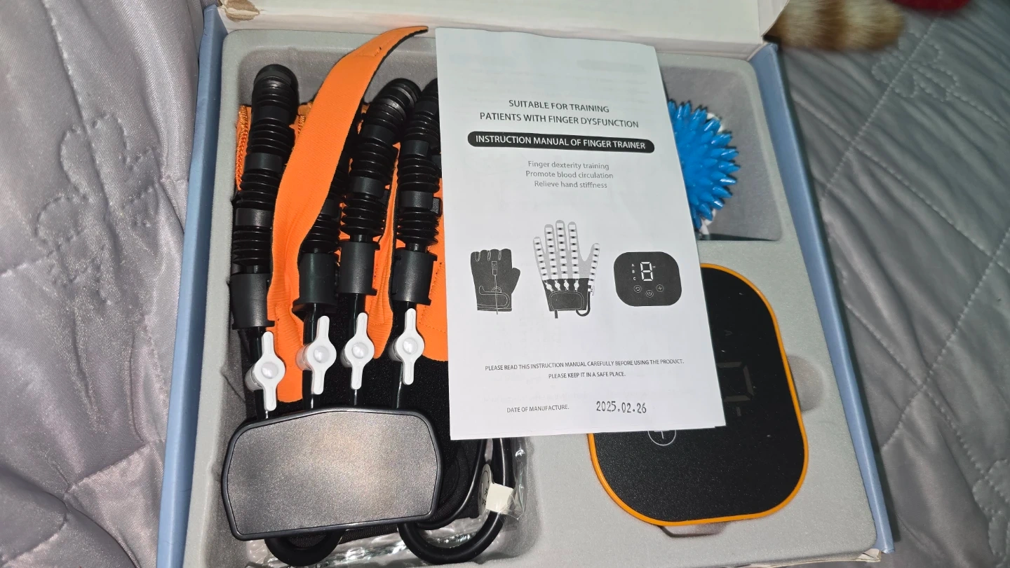 This is a hand function rehabilitation training device designed for patients with hand dysfunction. It's designed to provide hand flexibility training, promote blood circulation, and solve hand stiffness. It comes with an instruction manual and a power charging cable. The manufacturing date is 2025 February 26