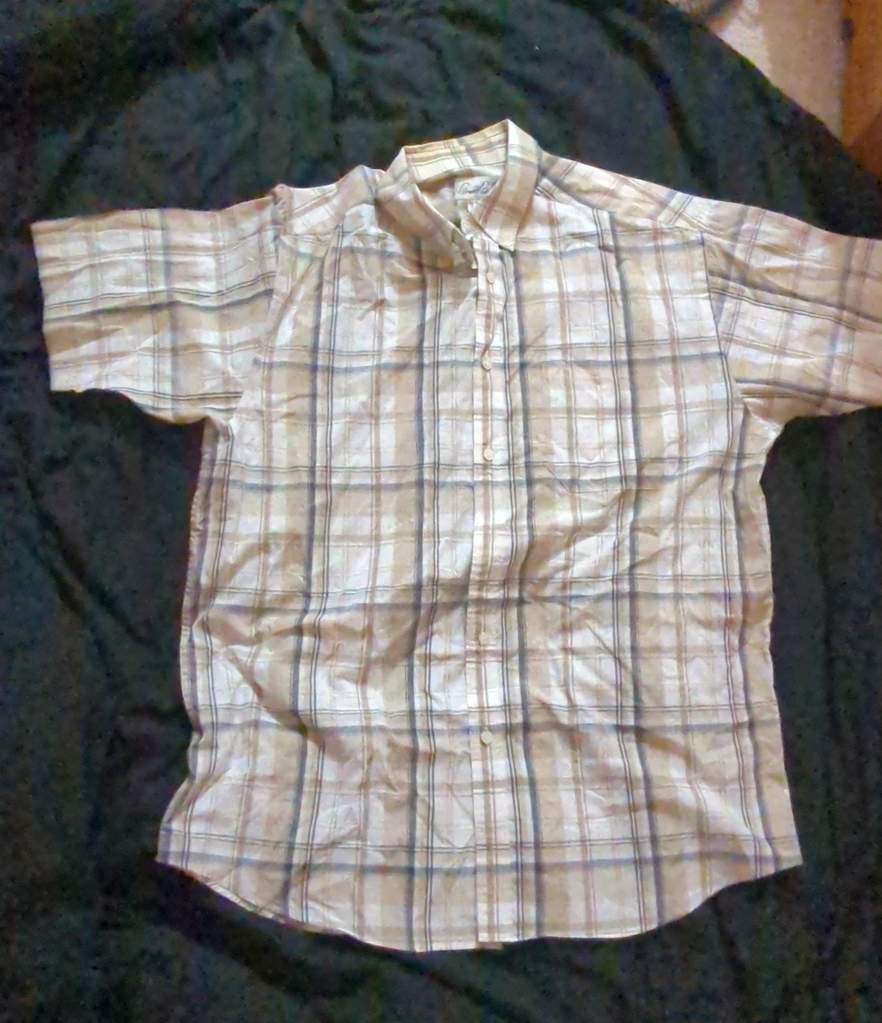 A men's short-sleeve button-up shirt with a classic plaid pattern. It's made from a lightweight fabric, perfect for casual wear. This shirt has a collared neckline and button closure. It's a versatile addition to any wardrobe!