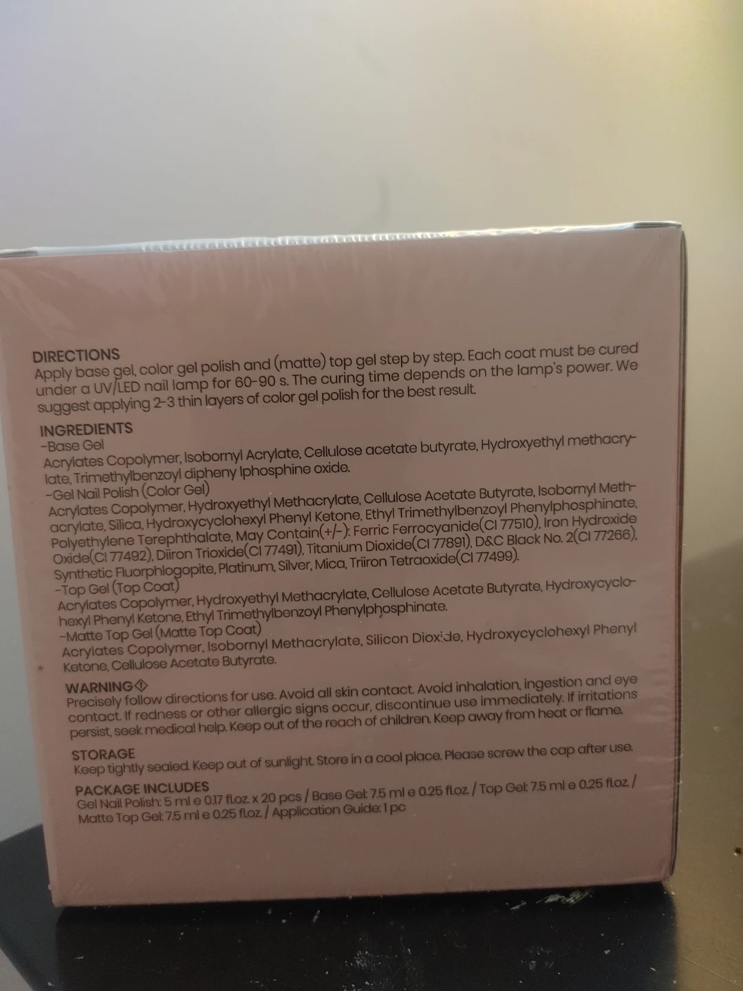 This set includes 20 gel polishes in the shade Modern Muse (CL136). Base gel is 7.5 ml and matte top coat is 7.5 ml. Polish bottles are 0.25 fl.oz each. Keep out of direct sunlight in a cool place.